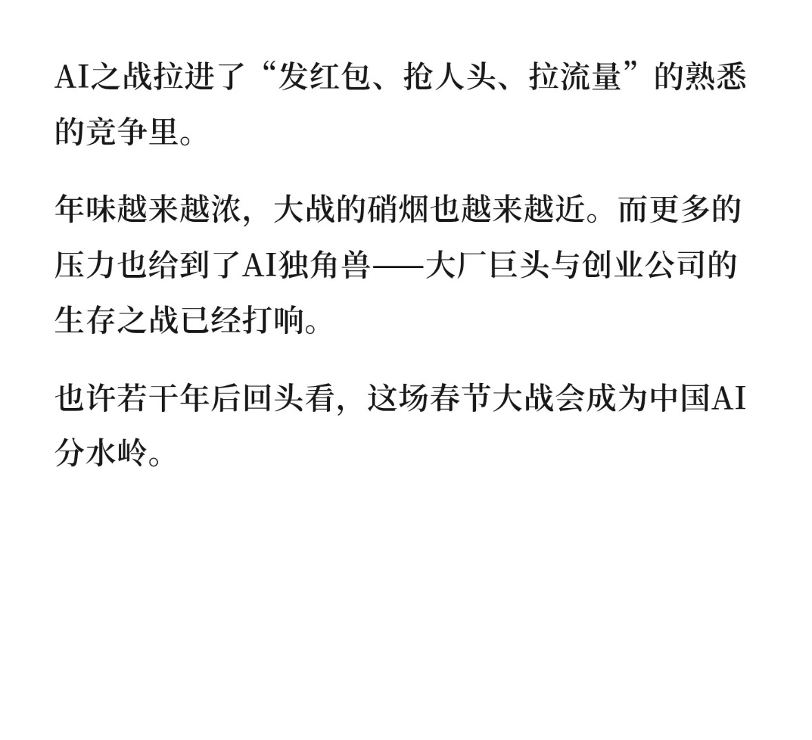 春节AI红包大战哪家强HOW I AI过个有AI年今年春节档有些热闹,互联网大厂开始从移动支付转向Ai流量入口争夺,战况也是相当激烈了。百度文心拿出5亿,元宝跟投10亿,千问直接30亿,烧钱拉新,还是熟悉的配方。字节就是纯卷内容,用优质内容买大家的时间。