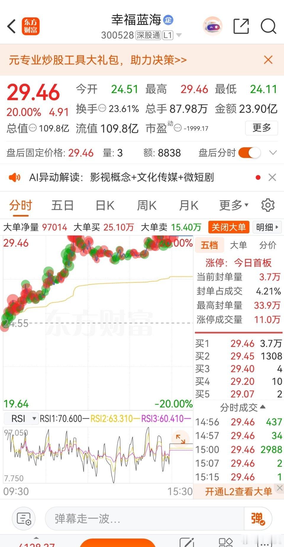兄弟们还记得前段时间分享的$幸福蓝海 sz300528$ 吗?