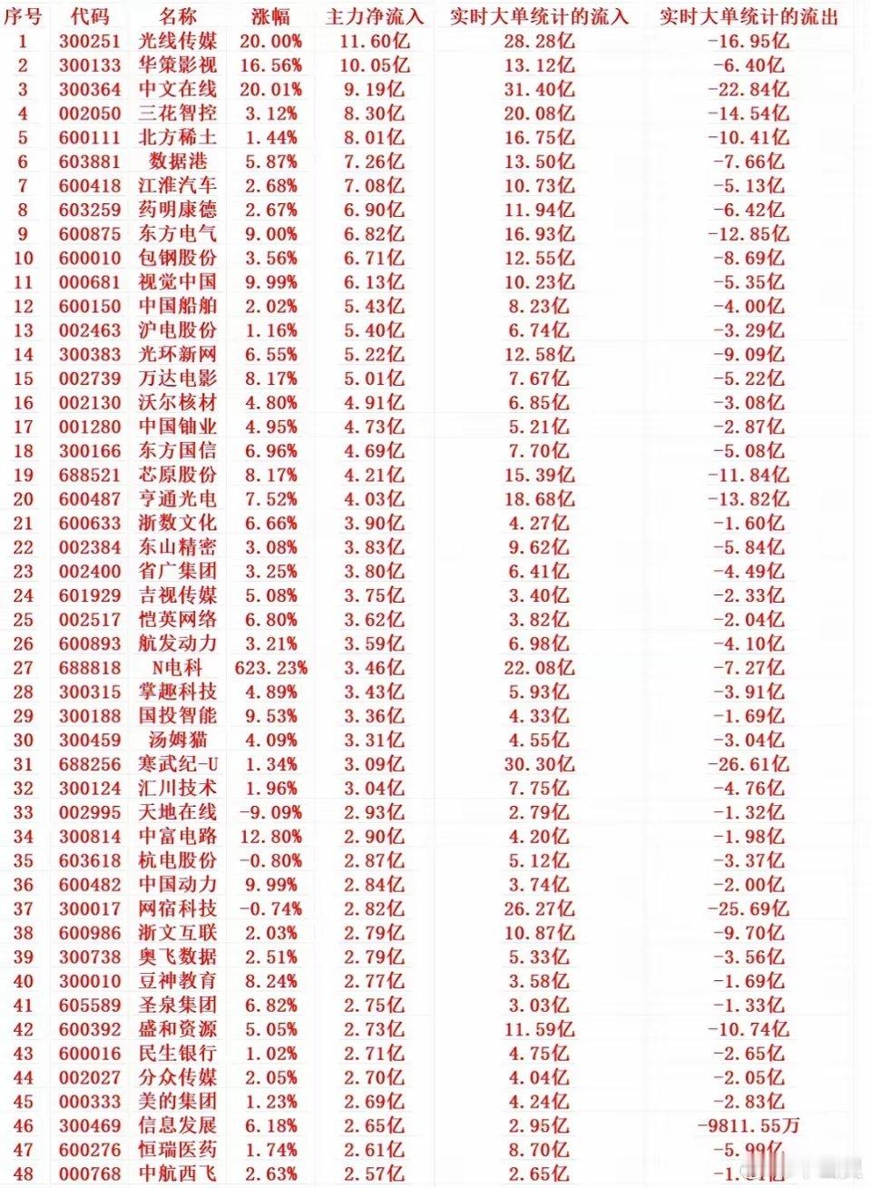 2月10号尾盘30分钟,主力资金“大幅抢筹的”个股名单一览!1 300251 光线传媒 20.00% 11.60亿 28.28亿 -16.95亿2 300133 华策影视 16.56% 10.05亿 13.12亿 -6.40亿3 300364 中文在线 20.01% 9.19亿 31.40亿 -22.84亿4 002050 三花智控 3.12% 8.30亿 20.08亿 -14.54亿5 600111 北方稀土 1.44% 8.01亿 16.75亿 -10.41亿6 603881 数据港 5.87% 7.26亿 13.50亿 -7.66亿7 600418 江淮汽车 2.68% 7.08亿 10.73亿 -5.13亿8 603259 药明康德 2.67% 6.90亿 11.94亿 -6.42亿9 600875 东方电气 9.00% 6.82亿 16.93亿 -12.85亿10 600010 包钢股份 3.56% 6.71亿 12.55亿 -8.69亿11 000681 视觉中国 9.99% 6.13亿 10.23亿 -5.35亿12 600150 中国船舶 2.02% 5.43亿 8.23亿 -4.00亿13 002463 沪电股份 1.16% 5.40亿 6.74亿 -3.29亿14 300383 光环新网 6.55% 5.22亿 12.58亿 -9.09亿15 002739 万达电影 8.17% 5.01亿 7.67亿 -5.22亿传媒娱乐板块是今天绝对主线。光线传媒、中文在线 20cm 涨停,华策影视大涨,主力净流入均超 9 亿,属于情绪最集中的方向。资金力度强、换手充分,是短线情绪核心。算力、数据中心、IDC 方向持续吸金。数据港、光环新网、奥飞数据、网宿科技等都有大额资金流入,哪怕网宿科技小幅收跌,主力依然净流入,说明资金在低位承接,不是纯追涨。硬核科技与半导体芯片有资金布局。沪电股份、芯原股份、寒武纪都出现大额净流入,尤其是寒武纪大单进出极其夸张,属于大资金重仓博弈的核心标的。新能源、汽车、稀土、家电等白马赛道有回流。三花智控、北方稀土、江淮汽车、美的集团等资金流入稳定,涨幅温和,属于趋势性资金,更偏稳健型配置。军工、船舶、电力设备资金明显加仓。中国船舶、航发动力、中航西飞、东方电气主力持续流入,偏向中线逻辑。