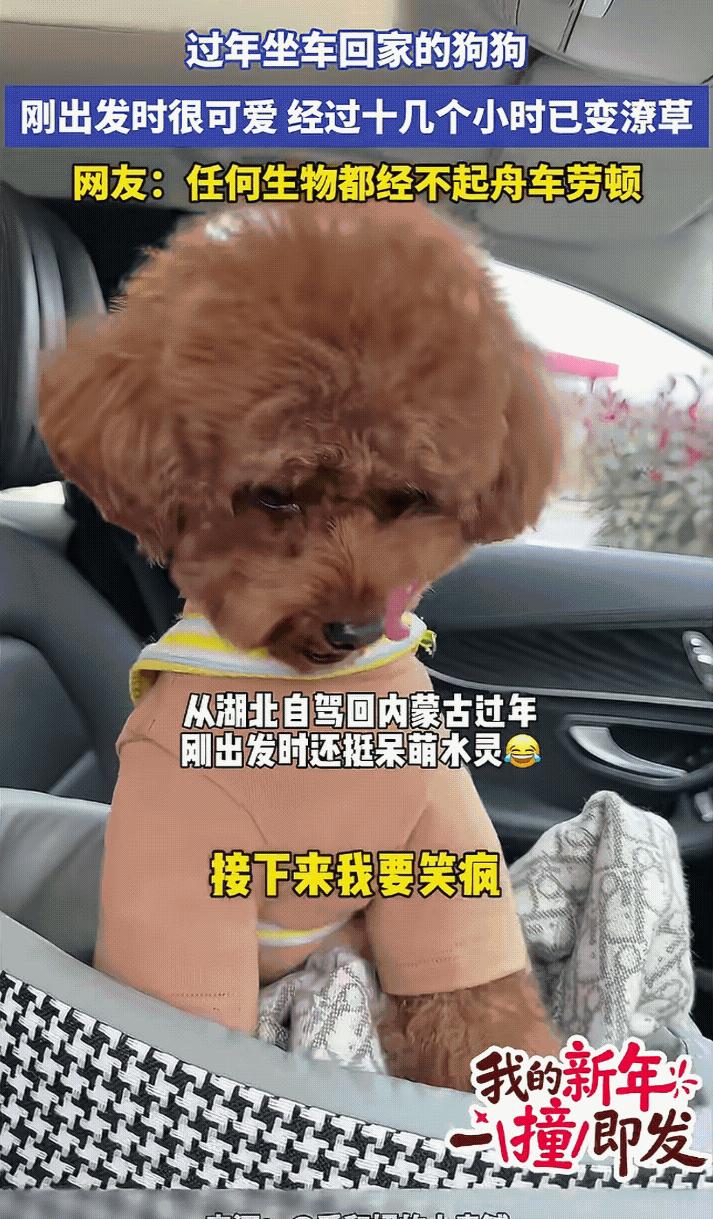 笑不活!一名主人带着她的泰迪狗狗回家过年,从湖北自驾回内蒙古,一路上主人把狗狗坐车的样子记录了下来。 最近刷到一个超真实的视频,一位主人带着自家泰迪,从湖北自驾回内蒙古过年,全程足足15个小时,一路上她随手记录下狗狗的状态,看完真的又好笑又心疼。 出发前,主人特意给泰迪收拾得干干净净,毛发梳得顺滑服帖,圆滚滚的小身子裹着舒服的小衣服,活脱脱一个精致的小公主,说是迷你版奥黛丽赫本都不夸张。 刚坐上车的时候,泰迪兴奋得不行,一点都不怯场,脑袋时不时探向车窗,眼睛亮晶晶地张望着前方的路,一会儿蹭蹭主人的胳膊,一会儿又乖乖坐好打量车内,活泼得停不下来。 可这份兴奋劲儿,终究没扛住长途车程的消耗。才过去两个小时,泰迪就明显乏了,原本亮晶晶的眼睛开始发沉,脑袋一点一点的,最后干脆把头靠在座椅上,蜷起小身子睡着了,小鼻子还时不时动一下,模样软乎乎的。 主人怕它着凉,还特意给它盖了一小块薄毯子,看着它熟睡的样子,忍不住放慢了车速,尽量让车子开得平稳一些,不打扰小家伙休息。 到了第7个小时,车子已经驶出了湖北境内,泰迪也换了个睡姿,从蜷着身子变成侧躺着,四肢随意伸着,耳朵耷拉着,依旧睡得昏昏沉沉,哪怕车子经过服务区减速,它也只是动了动耳朵,没醒过来。 主人趁着休息的间隙,给它喂了点温水,轻轻摸了摸它的脑袋,小家伙迷迷糊糊舔了舔嘴巴,又接着陷入沉睡,看得出来,是真的累坏了。 等到行驶到第10个小时,窗外的风景已经从翠绿变成了枯黄,气温也明显降了下来,泰迪终于醒了,但精神状态差到不行。 它趴在座椅上,脑袋耷拉着,眼神呆滞,原本顺滑的毛发也变得乱糟糟的,连尾巴都懒得摇一下,不管主人怎么逗它,它都只是懒洋洋瞥一眼,浑身写满了“疲惫”二字。 其实不光狗狗累,开了10个小时车的主人也早已疲惫不堪,但看着身边相依为命的小毛孩,又瞬间充满了动力,毕竟这是她们第一次一起自驾回家过年,再累也值得。 终于,在行驶了整整15个小时后,车子顺利抵达了内蒙古的老家,而此时的泰迪,已经彻底“潦草”出圈了。 原本精致顺滑的毛发乱得像鸡窝头,脸上还沾了点灰尘,眼睛里带着红血丝,模样蔫蔫的,但好在已经彻底睡醒了,下车的时候,还能勉强摇着尾巴跟着主人进门。 这段视频发到网上后,瞬间引发了网友们的热议,大家都被这只泰迪的反差萌逗笑了,同时也感同身受。 有网友调侃,这哪里是回家过年,这分明是“渡劫”,出发前是奥黛丽赫本,到家下车就变成了高士早苗,反差感拉满。 还有网友笑着说,太真实了,不管是人还是狗狗,都经不起这样的舟车劳顿,收拾得漂漂亮亮出发,十几个小时后,谁不是蓬头垢面、浑身疲惫呢。 也有养宠人士感同身受,留言说,潦草是潦草了些,但没晕车、没吐一车,就已经算是不幸中的万幸了,要是换做晕车的狗狗,这15个小时,恐怕要吐一路。 其实很多养宠人过年都有这样的困扰,不想把狗狗寄养在宠物店,担心它受委屈、不适应,就只能带着它一起自驾回家,哪怕路途遥远、多有不便。