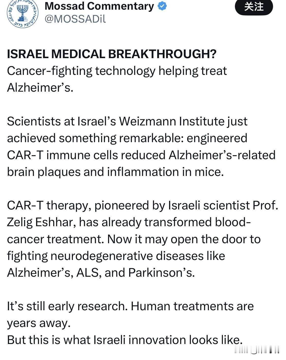 以色列医学专家抗癌技术助力治疗阿尔茨海默病。 以色列魏茨曼研究所的科学家们刚刚取得了一项非凡的成就:经过基因改造的 CAR-T 免疫细胞减少了小鼠体内与阿尔茨海默病相关的脑斑块和炎症。 由以色列科学家泽利格·埃沙尔教授开创的CAR-T疗法已经彻底改变了血液癌症的治疗。如今,它或许能为对抗阿尔茨海默病、肌萎缩侧索硬化症和帕金森病等神经退行性疾病打开一扇大门。 这项研究仍处于早期阶段,距离应用于人体治疗还有数年时间。 但这就是以色列创新的样子。
