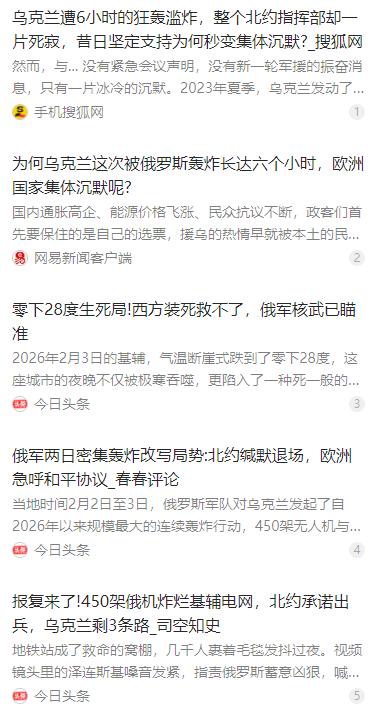 信号极度危险!面对6小时的狂轰滥炸,整个北约指挥部竟然死一般的寂静。很多人以为,这是西方国家在憋大招。错了!真相是,弃子已经被扔进了垃圾桶,没人愿意为一个必输的赌局再押注一分钱。 麻烦看官老爷们右上角点击一下“关注”,既方便您进行讨论和分享,又能给您带来更多优质的内容,感谢您的支持! 当前国际局势释放出极度危险的信号,面对针对乌克兰基础设施长达 6 小时的连续精确打击,北约总部始终保持异常沉默,没有紧急声明、没有增兵动作,也没有宣布新一轮大规模军援。 外界一度猜测,北约是在酝酿更大规模反击,准备憋出大招扭转局势。但现实并非如此,西方阵营已经开始冷静计算成本收益,不愿再为一场看不到胜利希望的博弈继续投入。 俄乌冲突爆发以来,北约长期采取不直接参战的策略,以武器输送、情报共享、人员培训等方式支持代理人作战,试图通过长期消耗达成地缘政治目标,冲突初期曾占据一定优势。 随着战场形势趋于僵持,持续 6 小时的高强度打击出现后,北约一反常态保持沉默,没有采取公开警告、强化前沿部署、加码军援等常见升级行动,态度明显转向克制。 北约并非铁板一块,冲突延续至今,欧洲多国承受着能源价格高企、工业成本上升、制造业外流等现实压力,这些经济代价已经转化为国内政治与民意压力。 欧洲多国政坛出现明显变化,反对持续援乌的声音不断扩大,民众更关注本土民生与经济稳定,而非遥远战场的胜负,政客不得不顺应民意调整政策。 北约高层同样存在明显顾虑,担心公开强硬表态会引发冲突外溢,危及欧洲本土安全与社会稳定,因此选择谨慎发声,整体军援节奏也逐步放缓。 战场早已进入漫长的消耗战阶段,北约对代理人的投入持续攀升,人员、装备、资金消耗巨大,但战略收益不断下降,投入与回报严重失衡。 在这样的背景下,西方阵营的止损逻辑逐渐清晰,不再愿意把更多资源押注在注定难以取胜的局面上,曾经的战略棋子,正在被现实重新评估价值。 这场沉默不是蓄力,而是战略转向的信号。西方的地缘算计终究要服从现实利益,当投入大于收益,所谓的承诺与支持,都会被冰冷的成本核算取代。 冲突发展到今天,已经充分说明代理人战争没有真正的赢家,长期消耗只会带来更多伤亡与破坏,推动和平谈判、尽快停火止战,才是符合各方利益的理性选择。