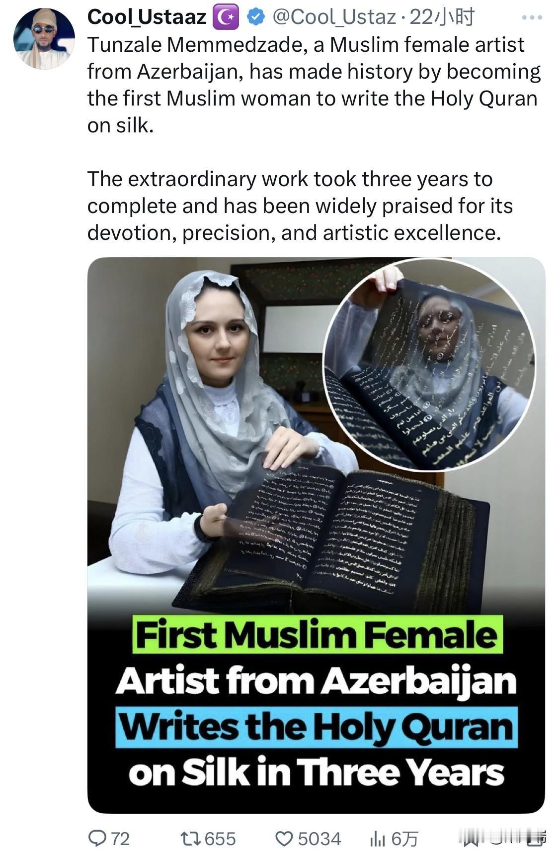 阿塞拜疆艺术家 图恩扎莱·梅梅扎德(Tünzale Memmedzade)因在丝绸上手书《古兰经》这一壮举而广受赞誉。她在土耳其马尔马拉大学(Marmara University)攻读艺术史博士学位期间完成了这一项目。 以下是关于这部丝绸《古兰经》的一些具体细节: 独创性:在开始创作前,梅梅扎德进行了广泛调研,发现虽然《古兰经》曾被书写在多种材质(如皮革、木材等)上,但从未有过在丝绸上完整书写的版本。 材料规格: 使用了约 50米(164英尺)长的透明黑色细丝绸。 消耗了约 1500毫升 的液体黄金和白银墨水进行手书。 每页尺寸约为 29 x 33 厘米。 文本依据:书写内容基于土耳其宗教事务局(Diyanet)发布的官方版本。 艺术意义:这部作品被认为是伊斯兰书法传统中的一项重大创新。虽然丝绸在伊斯兰教中是一种贵重的材料,但梅梅扎德指出,在《古兰经》本身中就有提到丝绸,因此在丝绸上书写圣书并不违背宗教法则。 这部作品曾作为重要藏品展出于美国史密森尼学会的 赛克勒美术馆(Sackler Gallery),在《古兰经的艺术》展览中亮相。