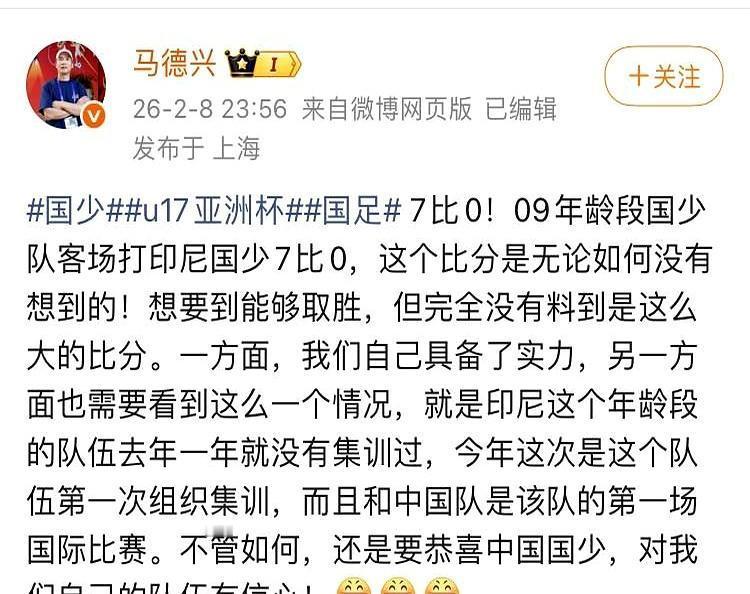 印尼队主教练一脚踹飞水瓶,身后,是中国队7:0的比分牌。 门将捂着脸蹲在地上,队友们眼圈通红。上半场4个,下半场3个,高位逼抢冲得他们后防线站都站不住,邝兆镭一个人就搅翻了天。 也别怪他们。这支印尼队刚组队集训,归化球员一个没来。而我们这帮09后的小孩,号称史上最强,刚在热身赛里把亚洲冠军乌兹别克给干了。 都说输球别骂孩子,那赢球了,这次可以先开香槟吗?