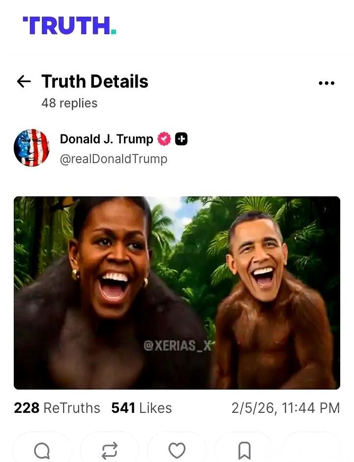 把前总统夫妇P成猴子,就两秒。 然后光速删除。 你真以为他是手滑了,或者老糊涂了? 别闹了。 这哪是政治手段,这分明是野兽的嘶吼。 你看他现在什么处境?这边一个性侵案,那边一个天价罚款,FBI像猎狗一样盯着他,自己党内的人都恨不得他赶紧消失。 他觉得脖子上架着刀呢。 所以他做这一切,什么竞选纲领,什么为国为民,你信吗? 我反正不信。 他现在干的所有事,都只有一个目的:活下去。 他要的不是权力,他要的是一张“免死金牌”。一张能让他和他的家族在他下台后,还能安安稳稳、不被清算的护身符。 那张两秒钟的猴子图,不是发给黑人看的,也不是发给民主党看的。 那是发给他自己人看的,发给那些摇摆不定的人看的—— “看,我已经没有退路了,我什么都干得出来。想活命的,就跟我一起疯。” 他不是在竞选总统,他是在招募敢死队。 他需要一个绝对忠诚,绝对听话的班子,给他看家护院,保证他四年后还能舒舒服服地打高尔夫。 说白了,什么党争,什么理念,在“活命”面前,都是P。 这才是最吓人的。