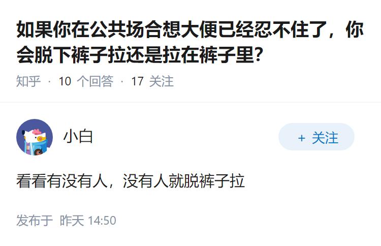 如果你在公共场合想大便已经忍不住了,你会脱下裤子拉还是拉在裤子里?