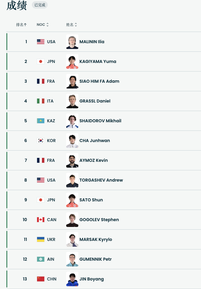 #金博洋男单短节目排名第13##马里宁男单短节目排名第一#