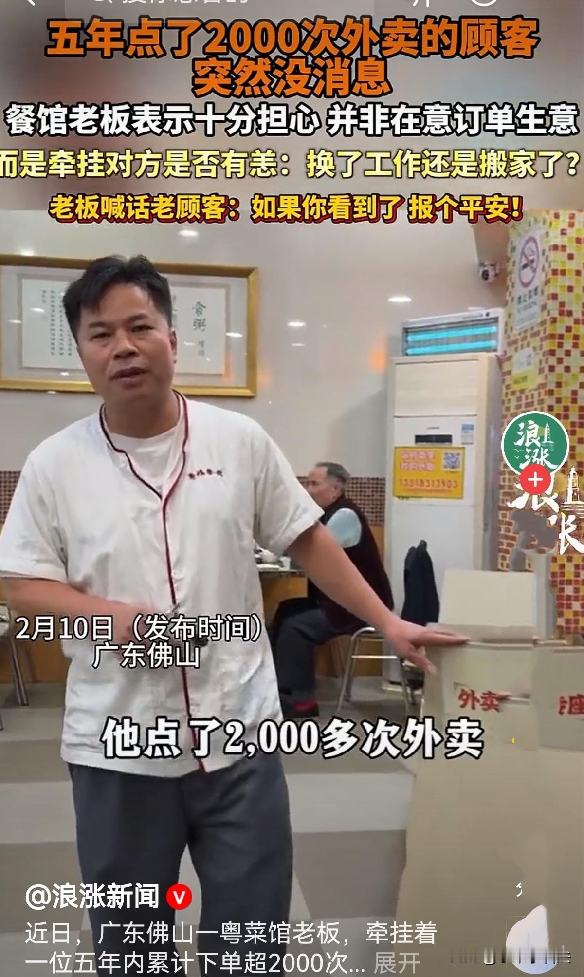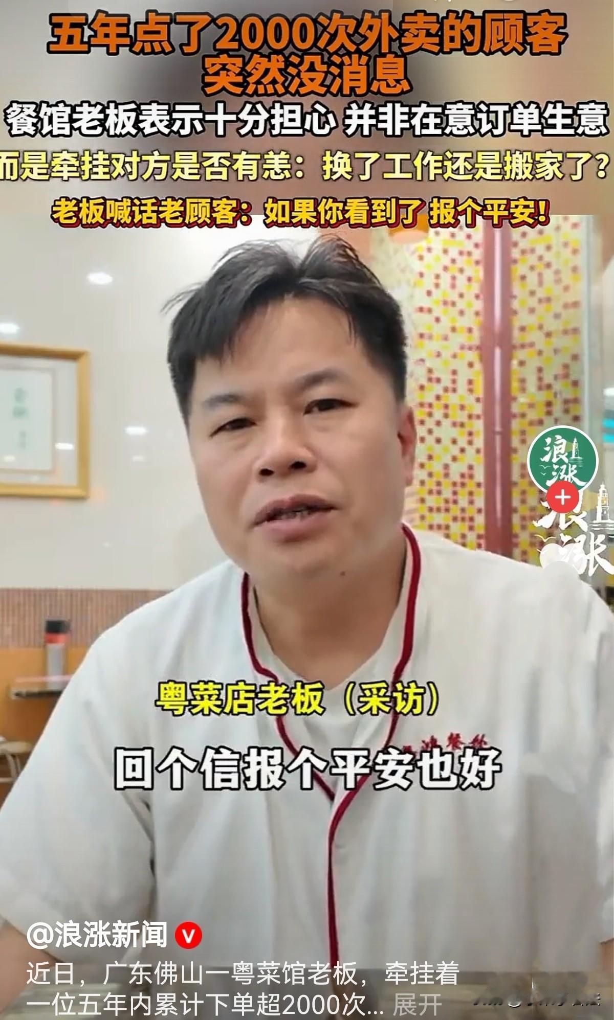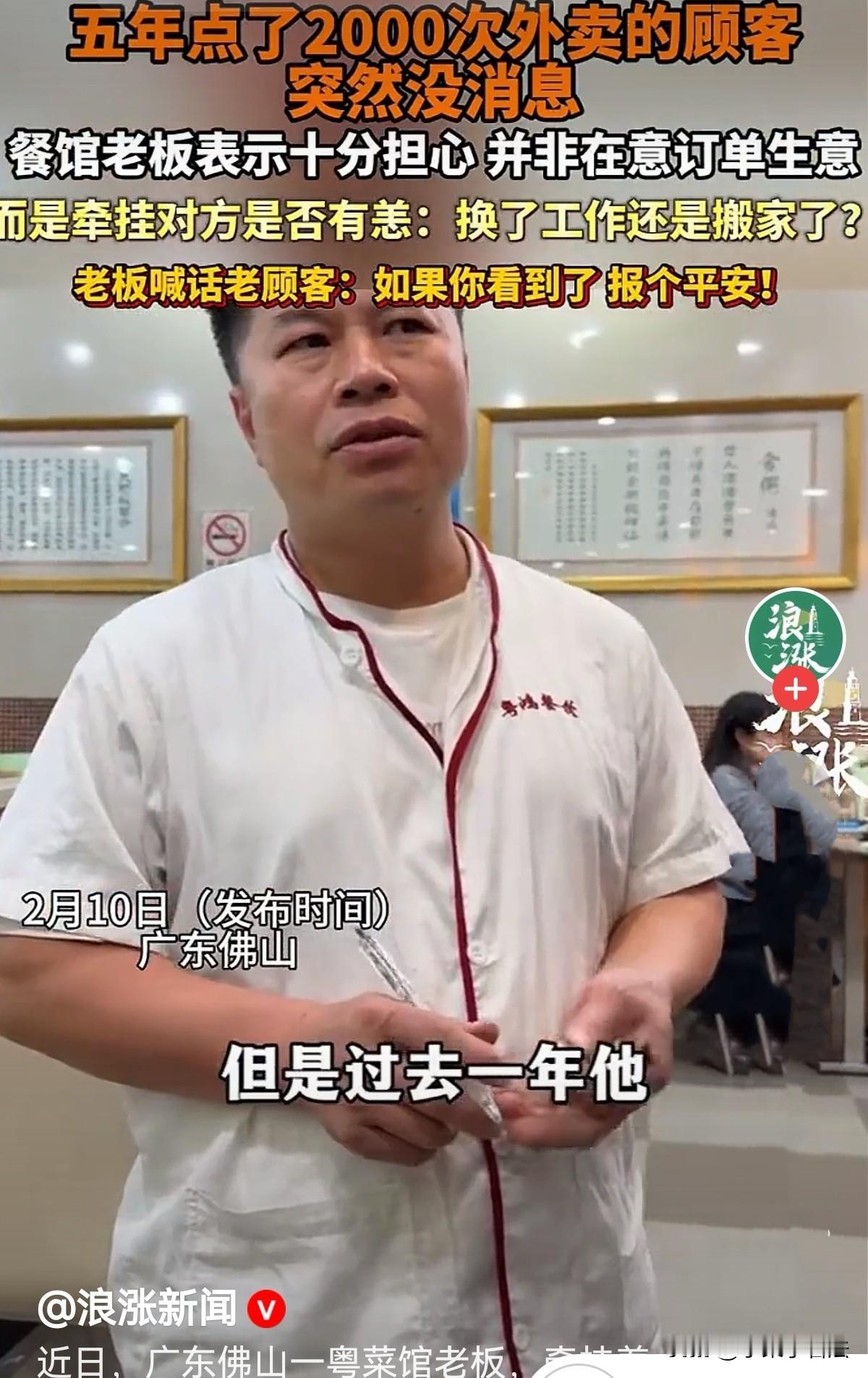 广东佛山,男子是一粤菜馆老板,一位老顾客在5年间点2000次外卖,在他心里,顾客已无形中成了他的朋友,而后,顾客突然不下单了,老板很是牵挂,放心不下,说不是在意订单生意,而是牵挂他是否有恙,是搬家了还是换工作了?他发视频喊话老顾客:如看到了,报个平安也好!网友:可能吃腻了,换了一家,也可能结婚了不用吃外卖了! 老陈的粤菜馆,烟火气十足! 他开店多年,从不搞花哨营销,凭着地道正宗的粤菜手艺,把白切鸡、豉汁排骨、虾饺这些经典菜式做得深入人心,也积攒下了一大批忠实的回头客。 在众多熟客里,有一位从未谋面的顾客,成了老陈心底最特殊、最放不下的牵挂。 这位顾客对老陈来说十分神秘,他连对方的性别、样貌都一无所知,却对其点餐习惯熟稔于心。 整整5年时间,2000多次外卖订单,一年核算400单,合上每天都有他的订单,几乎从未间断过。 这个客户成了店里最稳定的订单来源。每次下单,都是那几样固定的老味道,不换花样、不挑新品,俨然把这家小馆子当成了专属食堂。 5年的相伴,两千次的线上交集,早已让两人超越了普通的商家与顾客关系。老陈每次看到那个熟悉的收货地址和订单信息,心里都会涌起一股亲近感,似熟人又似朋友! 老陈虽在店中忙碌,但他早已习惯了手机里时常弹出的订单提醒,习惯了为这位老朋友精心备餐,这份无声的默契,成为他开店生涯里温暖的小慰藉。 他从未想过,这位朋友的信息会毫无征兆地戛然而止。 大约一年多前,老陈猛然发现,那个熟悉的订单再也没有出现过。 起初他并未在意,只当是客人工作繁忙、出差旅游,或是偶尔想换换口味。 可一天、一周、一个月、半年过去,订单依旧杳无音信,老陈的心,也一点点悬了起来。 闲暇时,他总会忍不住点开外卖后台,盯着那个熟悉的账号和地址发呆,满心盼望着下一秒能弹出新订单,可每次换来的都是失望。 他开始控制不住地胡思乱想:是换了工作搬去了别处?还是身体出了状况没法点外卖?又或是遇到了什么难以言说的难处? 这些猜测一股脑涌进大脑,让老陈挥之不去,他突然感觉心里空落落的。 他跟店里的伙计念叨,说这位客人默默支持了自己五年,风雨无阻,如今突然断了联系,不是在意他订单生意,是有种牵挂! 伙计们也对这位长情的顾客印象深刻,纷纷感慨老板的重情重义。 思来想去,老陈决定借助媒体,隔空喊话这位消失一年多的顾客:如果你能看到,一定要报个平安!我不是想做你的生意,就是单纯担心你,只想知道你平平安安的。 这番真诚的喊话迅速在网络传开,引来网友们的热烈讨论。 有人被老陈的人情味深深打动,夸赞他实在暖心; 也有人开玩笑猜测,说客人可能吃腻了换了店家,或是结婚成家有人做饭,不用再点外卖,甚至还有人打趣说“可能噶了! 面对各种暖心的理解、调侃的玩笑,甚至是部分网友的质疑,有人说时隔一年才寻人疑似炒作,有人怀疑食材品质、揣测动机,老陈都毫不在意。 他心里清楚,自己的牵挂发自肺腑,开店多年,他始终用真材实料做菜,凭良心做生意,这份担心无关利益,只关人心。 有人说,快节奏的生活,吃饭都成了速食消费,难得再有这样细腻的情感联结。可老陈用最朴素的行动证明,市井烟火气里,藏着最动人的人间真情。 5年2000次外卖,是客人的长情坚守;一年多牵肠挂肚的寻找,是老板的纯粹善意。 如今,老陈依旧守着他的小粤菜馆,每天用心翻炒着每一道菜品,心里始终盼着那位老朋友的消息。 他说,无论对方以后还会不会来点外卖,都只愿他平平安安、顺顺利利。 如果哪天想重温老味道,他依旧会像过去五年一样,用心做好每一道菜,静静等候这位未曾谋面的老朋友。 老陈小餐馆里的平凡小事,没有波澜壮阔的情节,却藏着直抵人心的温暖。 世间最珍贵的从不是利益,而是人与人之间最简单、最纯粹的牵挂。 对此您怎么看?