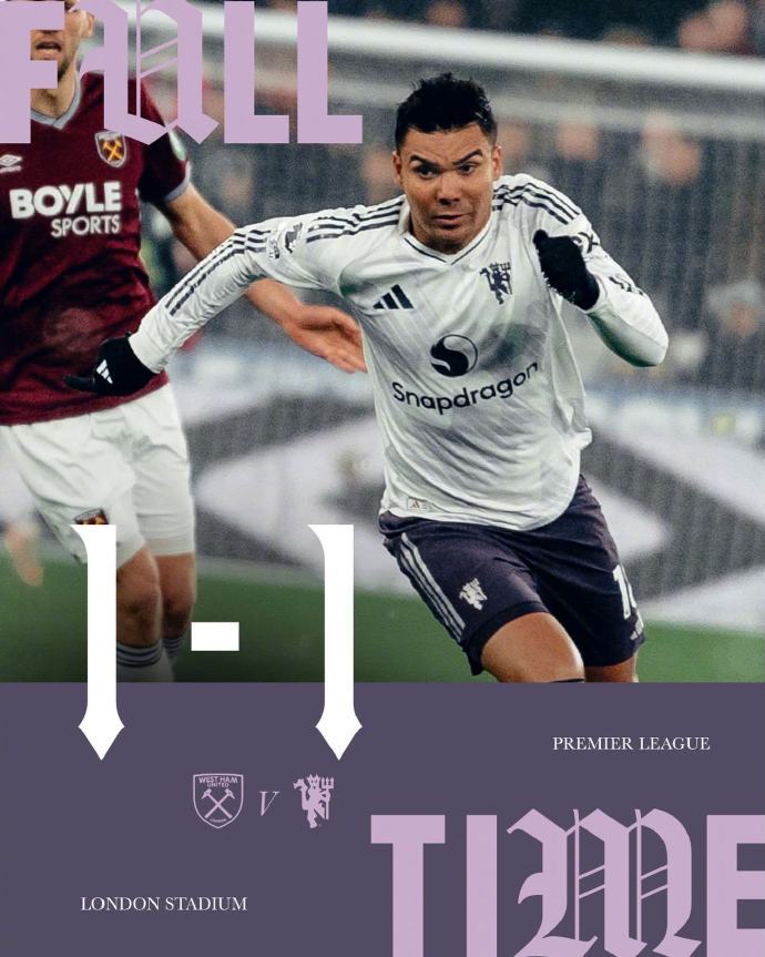 英超第25轮,曼联1-1绝平西汉姆,切尔西2-2利兹联,双方近期的4轮连胜均遭到终结。