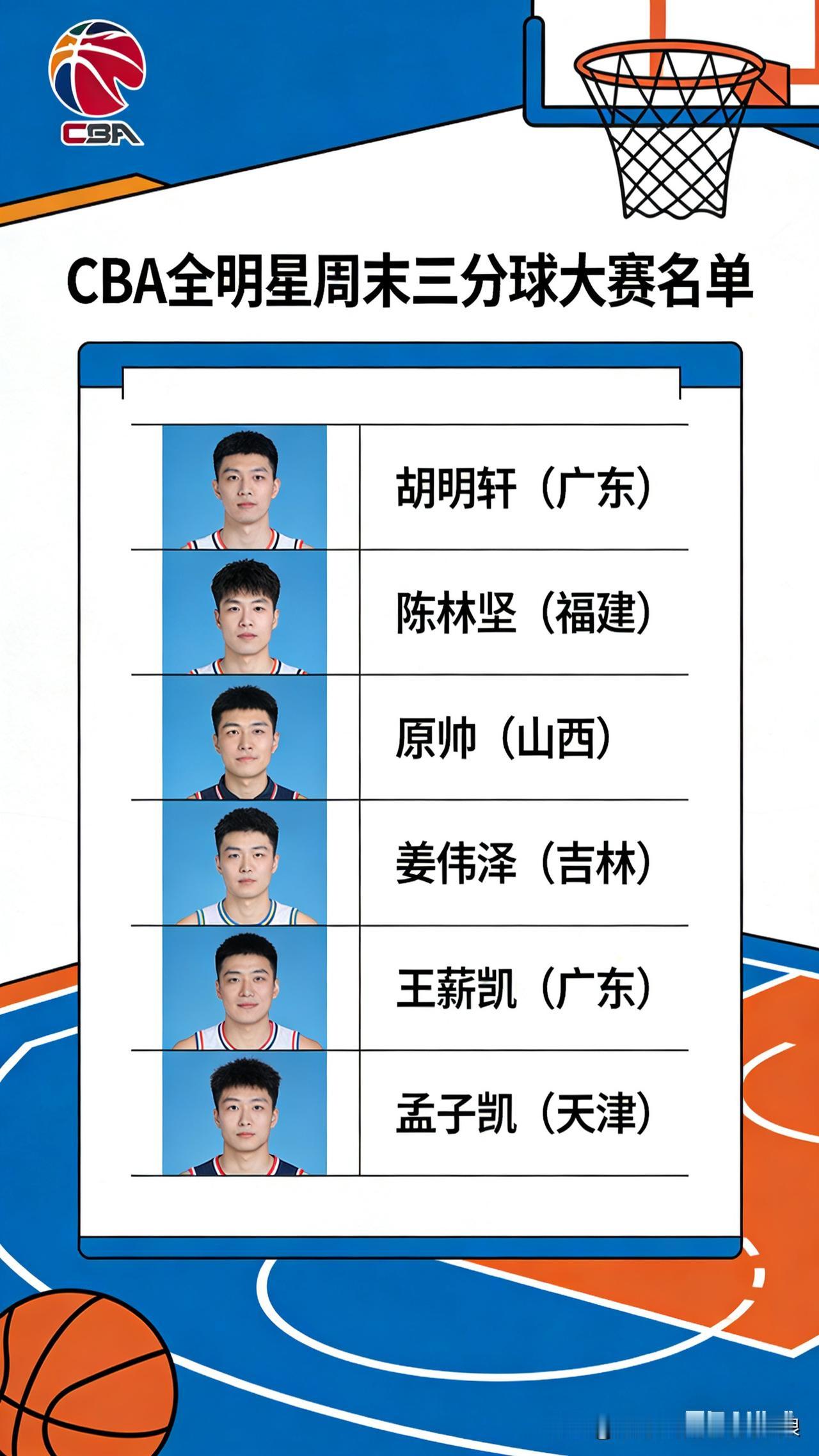 CBA官宣!三分大赛名单出炉,神仙打架来了 CBA正式公布全明星三分球大赛名单,一共9人参赛,看点拉满。 两大前三分王领衔:胡明轩、陈林坚,都是拿过冠军的射手,经验足、手感稳。还有姜伟泽、于米提、刘颜诚等联赛热门投手,个个三分准头在线。另外还有福建曾凌铉、宁波宁鸿宇,以及特邀大学生球员叶润峰,再加一名外卡选手,阵容很有看点。 预赛3月7日打,决赛3月8日全明星赛中场决出冠军。老炮稳、新人猛,谁能投出最高分拿下三分王?CBA官宣全明星周末三分球大赛名单
