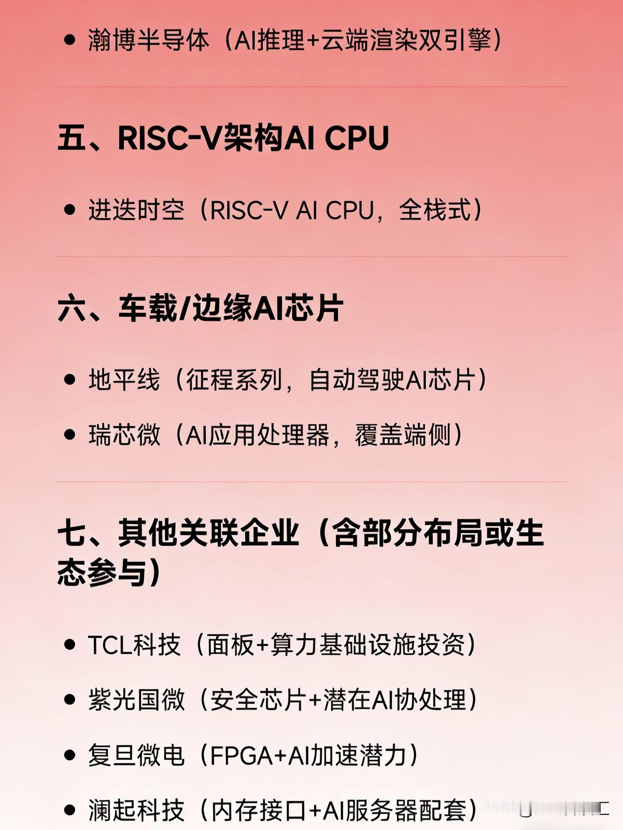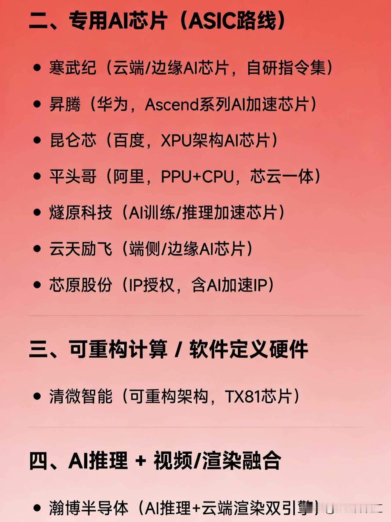 AI芯片概念相关企业的分类汇总 一、通用GPU / 全功能GPU路线 海光信息(DCU,类CUDA架构) 摩尔线程(全功能GPU,MUSA架构) 沐曦股份(高性能训推一体GPU) 壁仞科技(高端GPU) 天数智芯(通用GPU) 景嘉微(国产通用GPU量产)   二、专用AI芯片(ASIC路线) 寒武纪(云端/边缘AI芯片,自研指令集) 昇腾(华为,Ascend系列AI加速芯片) 昆仑芯(百度,XPU架构AI芯片) 平头哥(阿里,PPU+CPU,芯云一体) 燧原科技(AI训练/推理加速芯片) 云天励飞(端侧/边缘AI芯片) 芯原股份(IP授权,含AI加速IP)   三、可重构计算 / 软件定义硬件 清微智能(可重构架构,TX81芯片)   四、AI推理 + 视频/渲染融合 瀚博半导体(AI推理+云端渲染双引擎)   五、RISC-V架构AI CPU 进迭时空(RISC-V AI CPU,全栈式)   六、车载/边缘AI芯片 地平线(征程系列,自动驾驶AI芯片) 瑞芯微(AI应用处理器,覆盖端侧)   七、其他关联企业(含部分布局或生态参与) TCL科技(面板+算力基础设施投资) 紫光国微(安全芯片+潜在AI协处理) 复旦微电(FPGA+AI加速潜力) 澜起科技(内存接口+AI服务器配套)