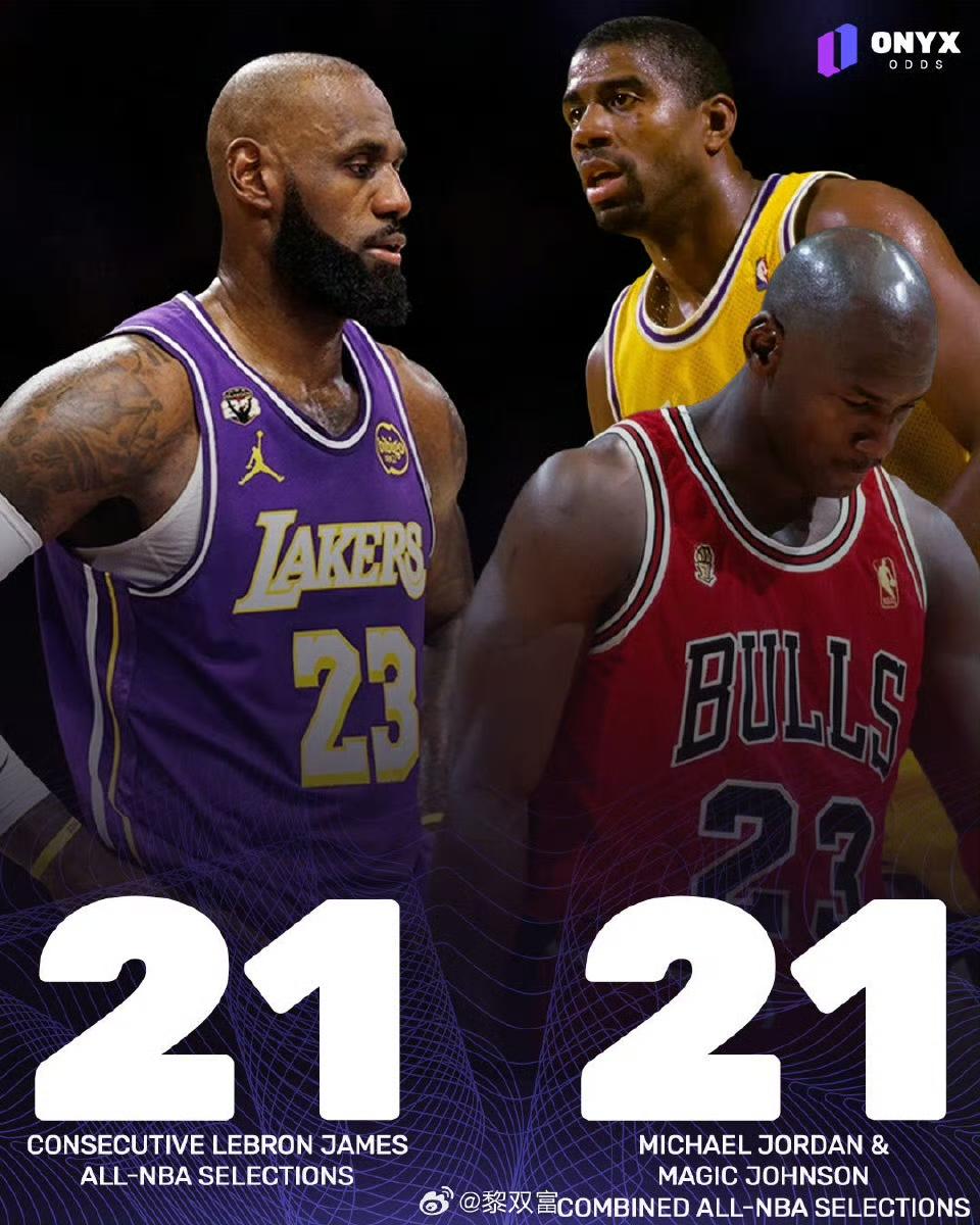 乔丹➕魔术师🟰詹姆斯! 詹姆斯生涯共21次入选NBA最佳阵容,且实现了连续21年入选的历史独一档成就(新秀赛季除外)。 迈克尔·乔丹生涯入选11次最佳阵容,魔术师·约翰逊生涯入选10次,两人合计正好是21次,与詹姆斯一人的总次数持平。 2025-26赛季,詹姆斯因出场数未达到联盟规定的65场评选门槛,无缘年度最佳阵容,这也让他连续21年入选的传奇纪录正式画上句号。 这个纪录不仅体现了詹姆斯长达二十余年的巅峰统治力,也侧面印证了他在NBA历史上的独特地位——他的最佳阵容次数,等于两位传奇巨星的总和。 爆料