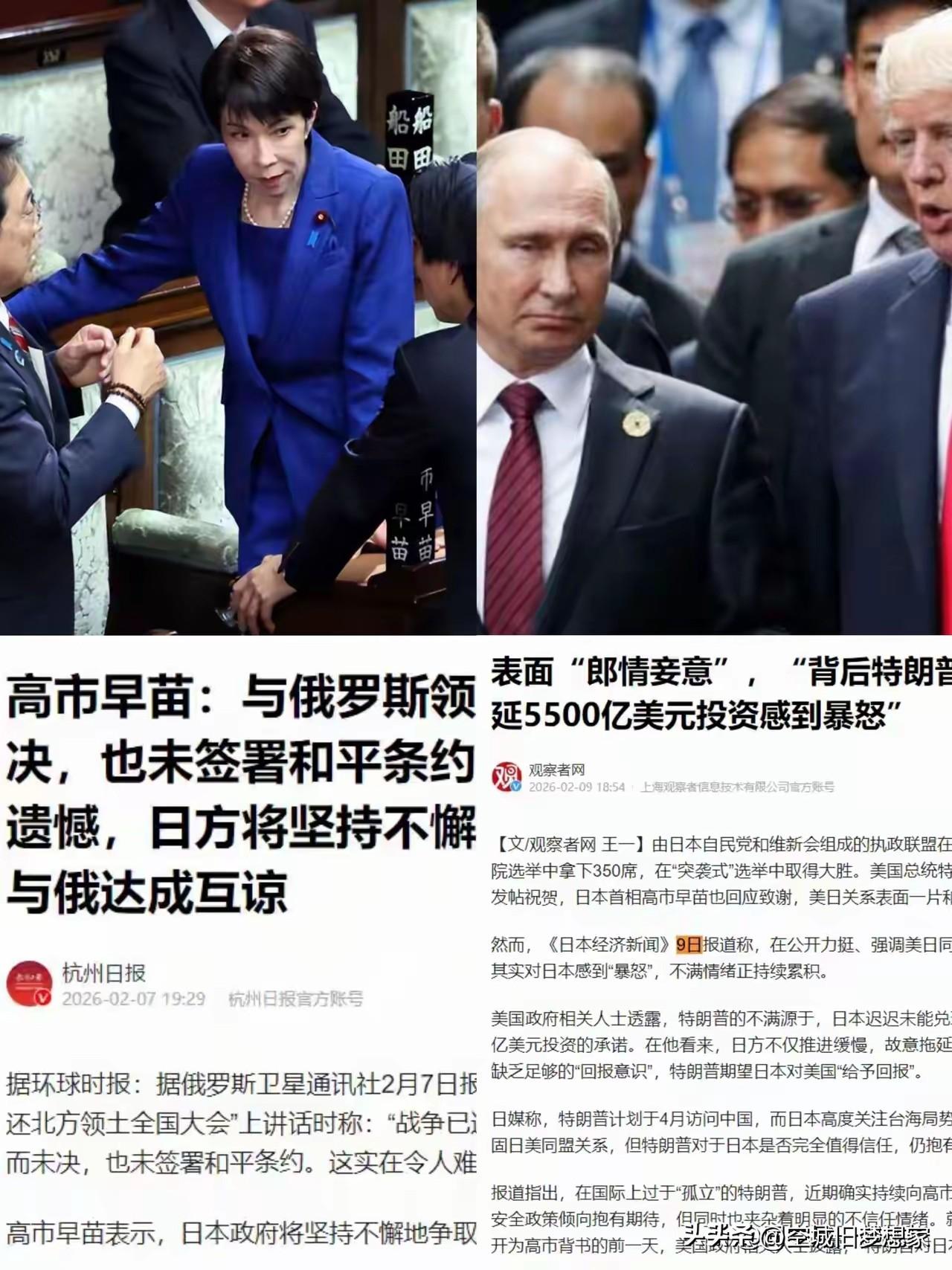 高市早苗:忘了80年前被苏联按在地上摩擦的疼了? 日本首相高市早苗又在北方领土大会上表演“嘴强王者”: “二战结束80年,领土没谈成,和平条约没签,谈不拢就更强硬!” 我就想问一句:二战时苏联红军横扫关东军,把北方四岛直接收走的记忆,是被你选择性删除了吗? 历史上日本跟俄罗斯掰过多少次手腕? 日俄战争赢了,那是赌上国运,最后也没吞下东北; 二战末期,苏联红军一周干碎80万关东军,日本连还手的机会都没有; 现在俄罗斯是瘦死的骆驼比马大,核武库、核潜艇、战略轰炸机都在,“战斗民族”的名号,是靠真刀真枪打出来的,不是靠嘴炮吹出来的。 现在高市早苗拿领土问题当政治秀,一边对俄放狠话,一边又跟美国眉来眼去。可美国自己都因为5500亿投资的事对日本“暴怒”,这种“左右横跳”的操作,真能帮日本拿回领土? 别逗了。 所谓“更强硬手段”,无非是: - 多开几次记者会; - 多拍几张握拳的照片; - 多骗一波选票。 真要动真格的,先问问俄罗斯的“锆石”导弹答不答应。 高市早苗 日俄领土争议 北方四岛 日本外交