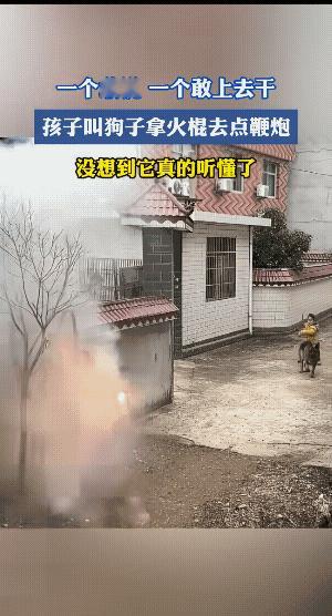 狗叔:为了陪你玩儿,俺这也是豁出了。 没想到狗叔它还真的听懂了小孩子的话,它不仅把炮仗点着了,而且点着后还知道赶紧跑开,了不得。