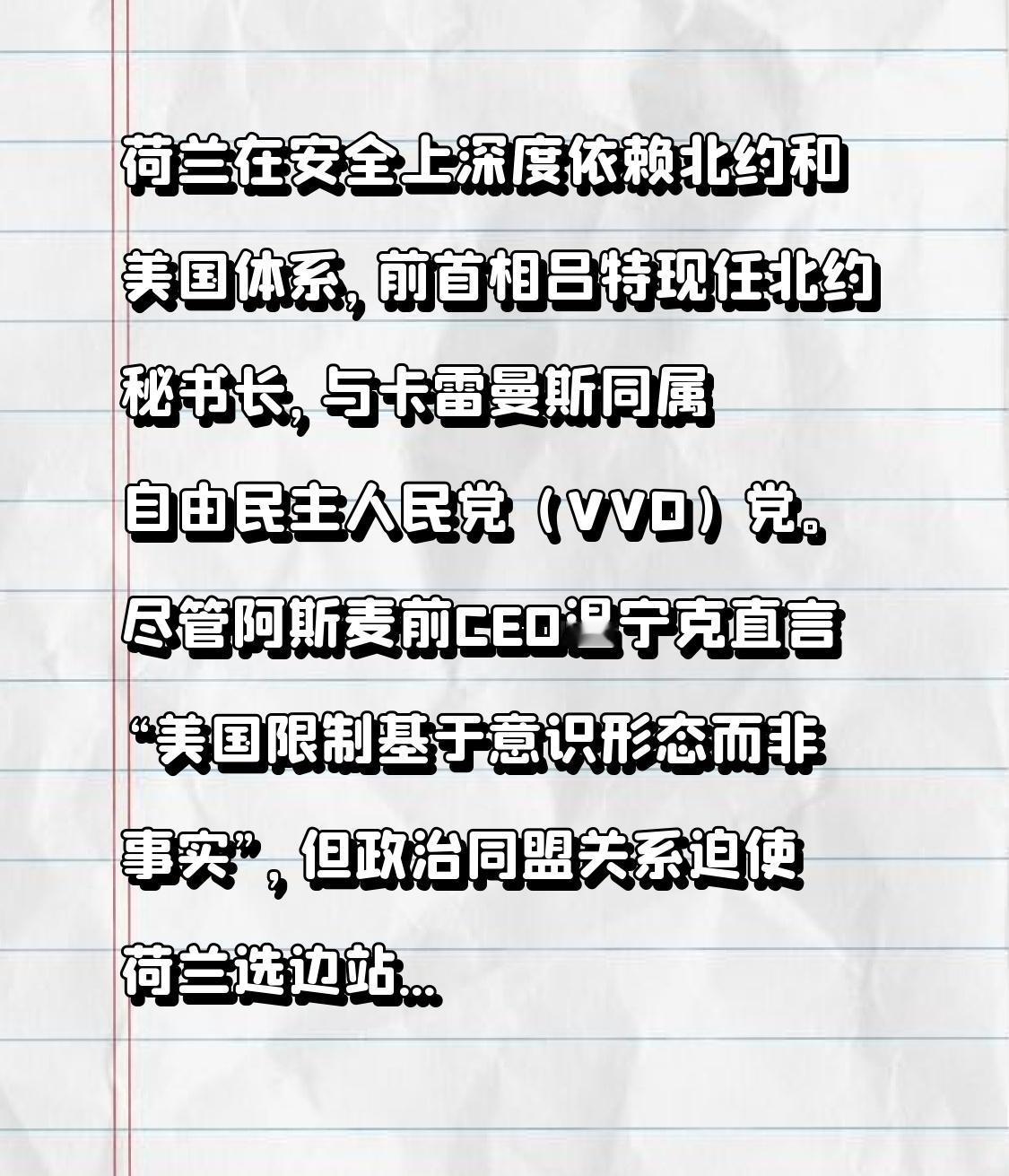 荷兰在安全上深度依赖北约和美国体系,前首相吕特现任北约秘书长,与卡雷曼斯同属自由民主人民党(VVD)党。尽管阿斯麦前CEO温宁克直言“美国限制基于意识形态而非事实”,但政治同盟关系迫使荷兰选边站队。