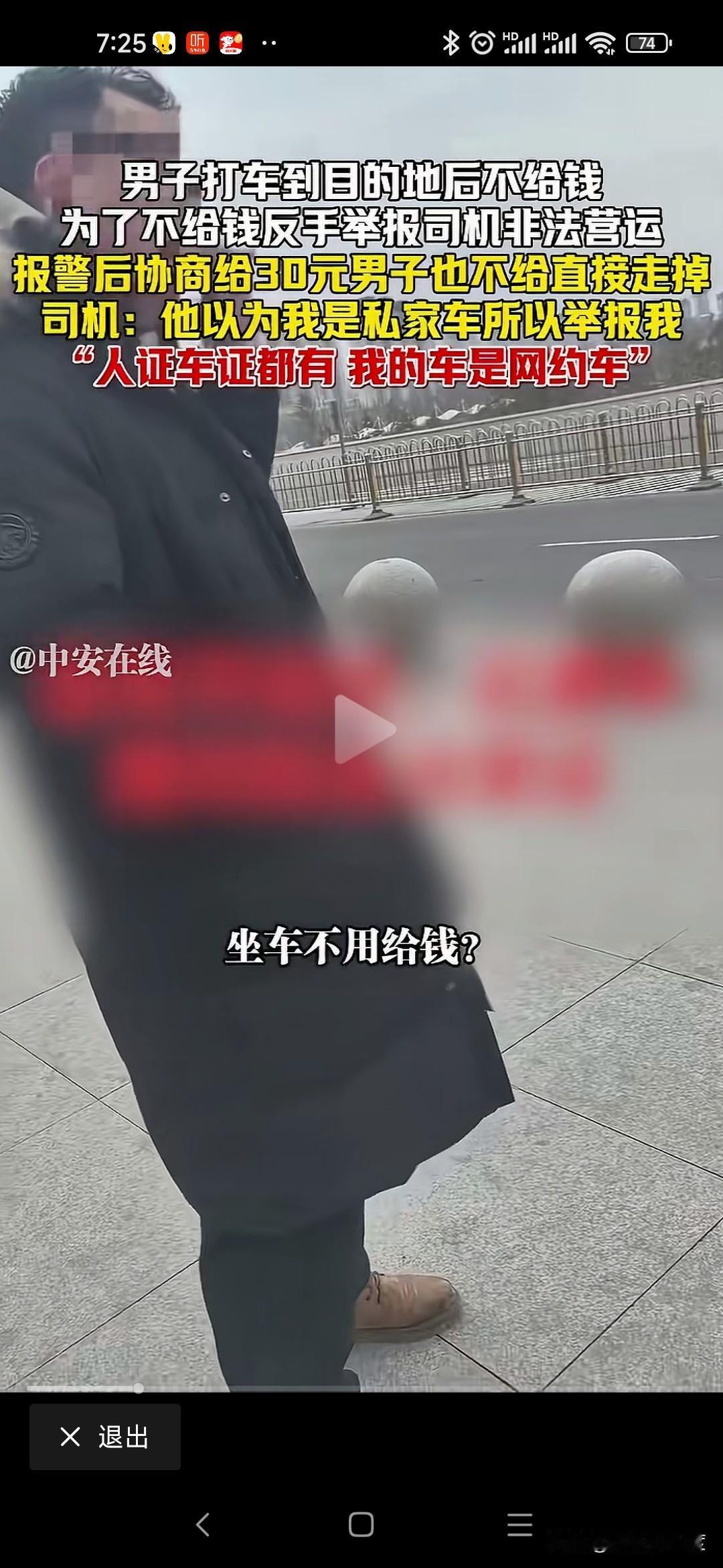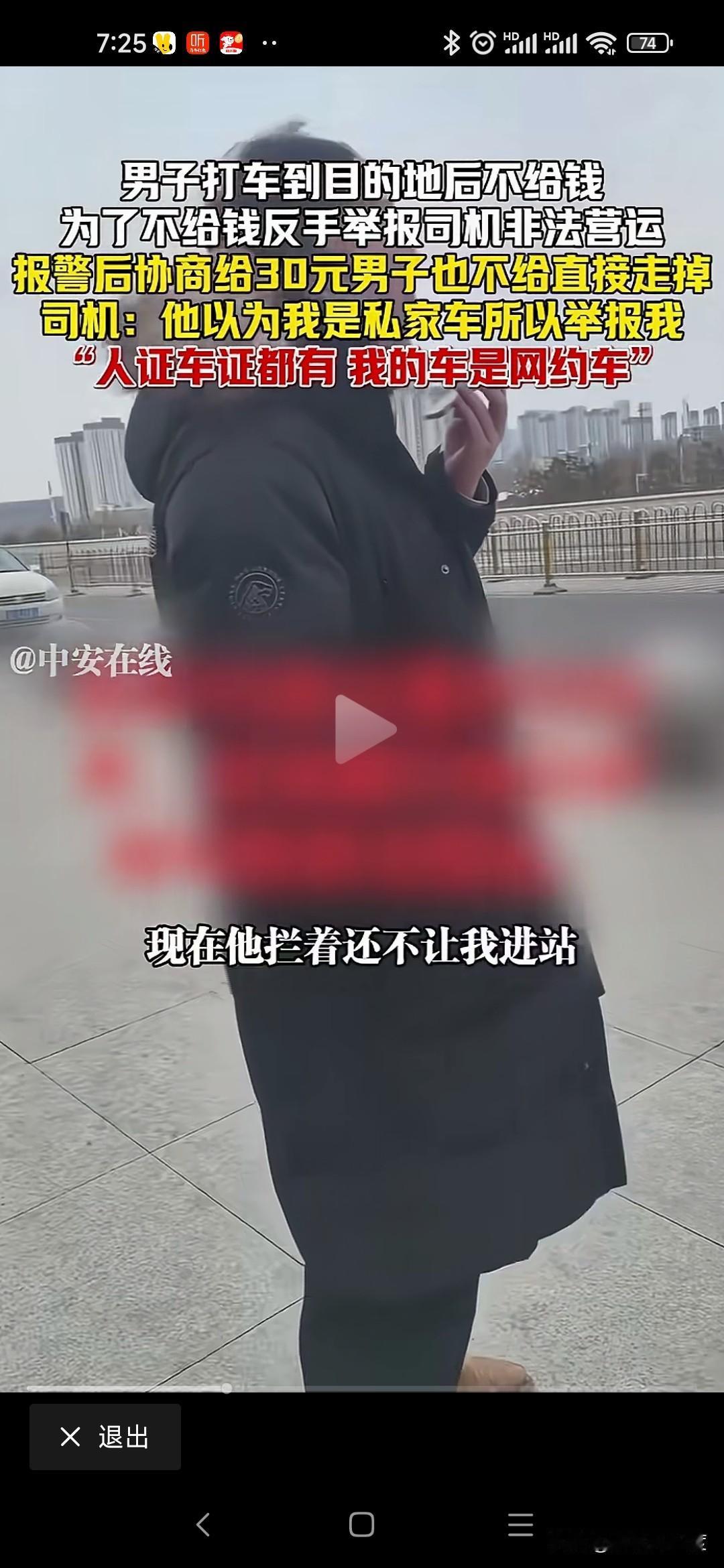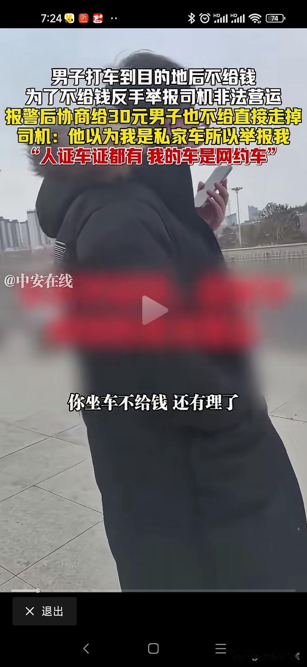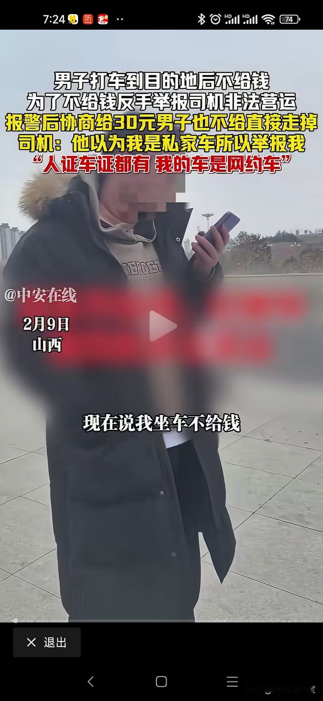 山西男子打车不给钱恶人先告状 山西男子打车从阳城到晋城东站70公里路程,过路费20运费30司机收50元。 男子耍无赖不给,不给钱还举报司机非法运营。 司机是正规网约车,人证车证运营证齐全,也没有多要钱,乘客就耍无赖不给钱。 司机拦着他不让进站,报警处理还打电话举报司机非法运营。 僵持40分钟就是不给钱,警察调和不给50给30行吧,我不给转身进站坐高铁了。 无奈司机把这个视频传到网上,让大家评判一下! 这种事时有发生,咱也不能听信一人之言,特意百度地图查看一下,顺风车58一位,其他上百元。 就算这个抠搜男打的顺风车,人家要50不贵吧,怎么还能无理搅三分不给呢? 是山西人就这么能算计会过?还是你一直这样耍无赖举报威胁司机逃单?你家的财富就这样积累的吗? 警察最会和稀泥,打车给钱天经地义,凭什么他不给钱就让走,说要的多你可以投诉我举报我,为什么不给钱就放他走,和稀泥执法最可恨,助长这样无赖的嚣张气焰。 这次助阵司机,支持司机维护自己的正当权益!