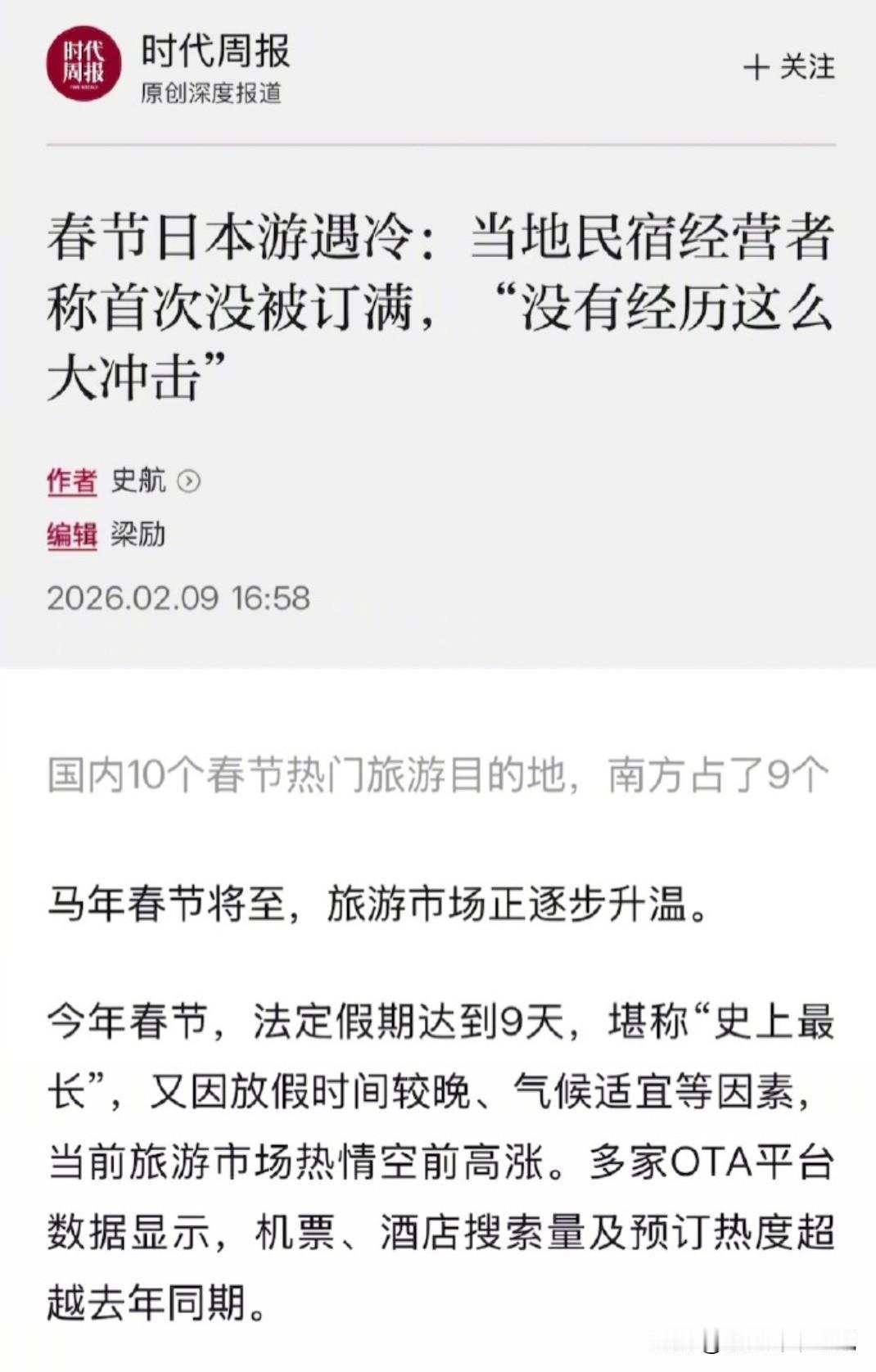 此次春节日本民宿也终于吃到了苦果,居然首次出现了没被订满的情况,这可是历史首次!还记得前段时间因为日本暴雪,很多国内游客被迫长时间滞留机场无法回国的情况吧,这帮人在网上呼吁国家出手帮助后,在网上收获了众多网友的嘘声。国家三番五次提醒不要去日本、不要去日本,这帮人倒好依然我行我素,那么自己就要承担应有的后果。再加上日本不断搞事和糟糕的治安,如果还要不顾一切的前往日本“送钱”,那真的是有种不顾一切的感觉了。老铁们可以在春节期间多看看朋友圈,看看有哪些人依然去日本旅游了,以后对这帮人还是保持距离的好。