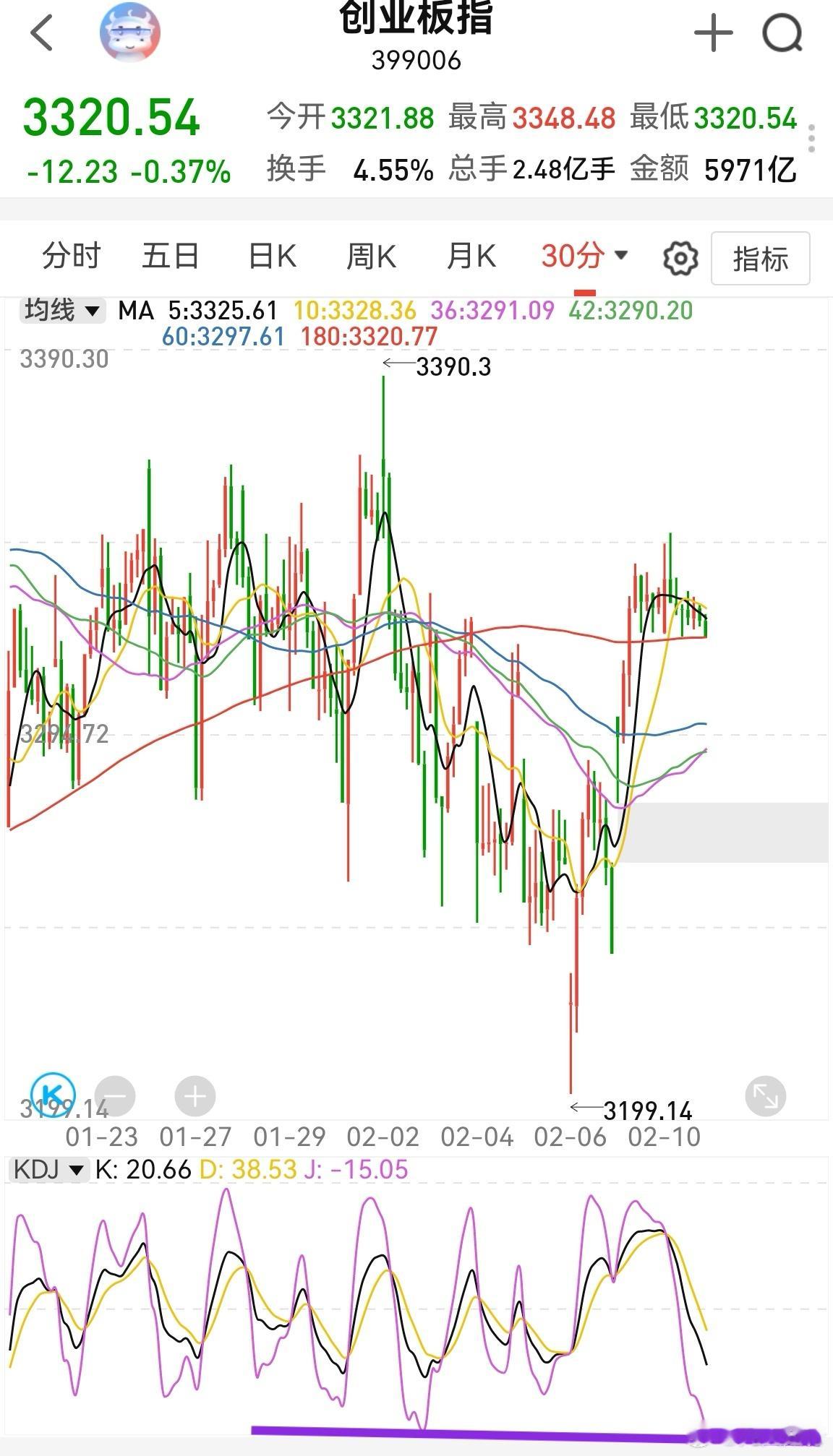创业板半小时kdj已经回落到超卖区,下跌空间有限,预计继续小阴小阳爬坡。