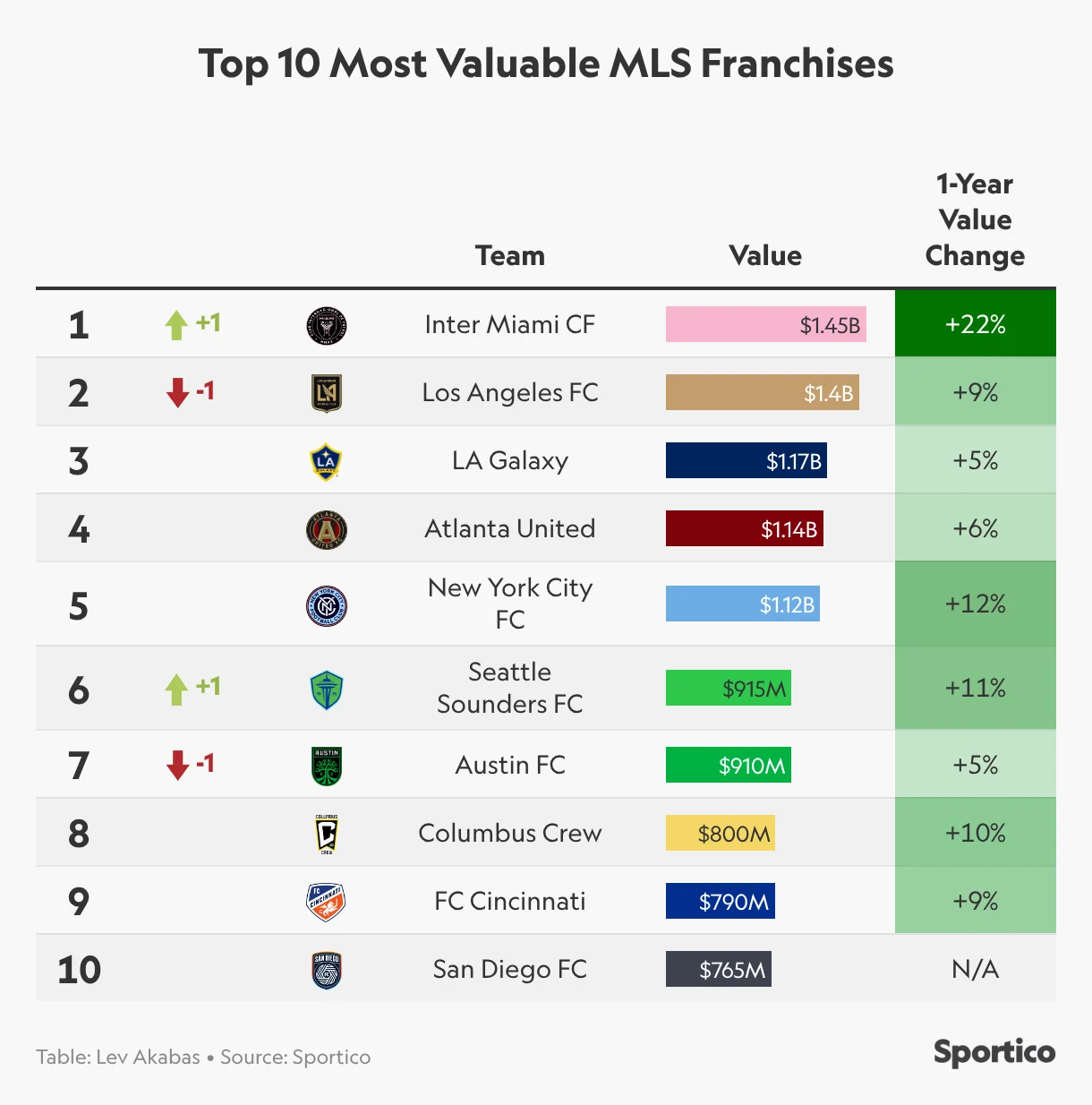 💰梅西效应!2026年美职联球队商业价值排行榜:迈阿密国际14.5亿美元居首!