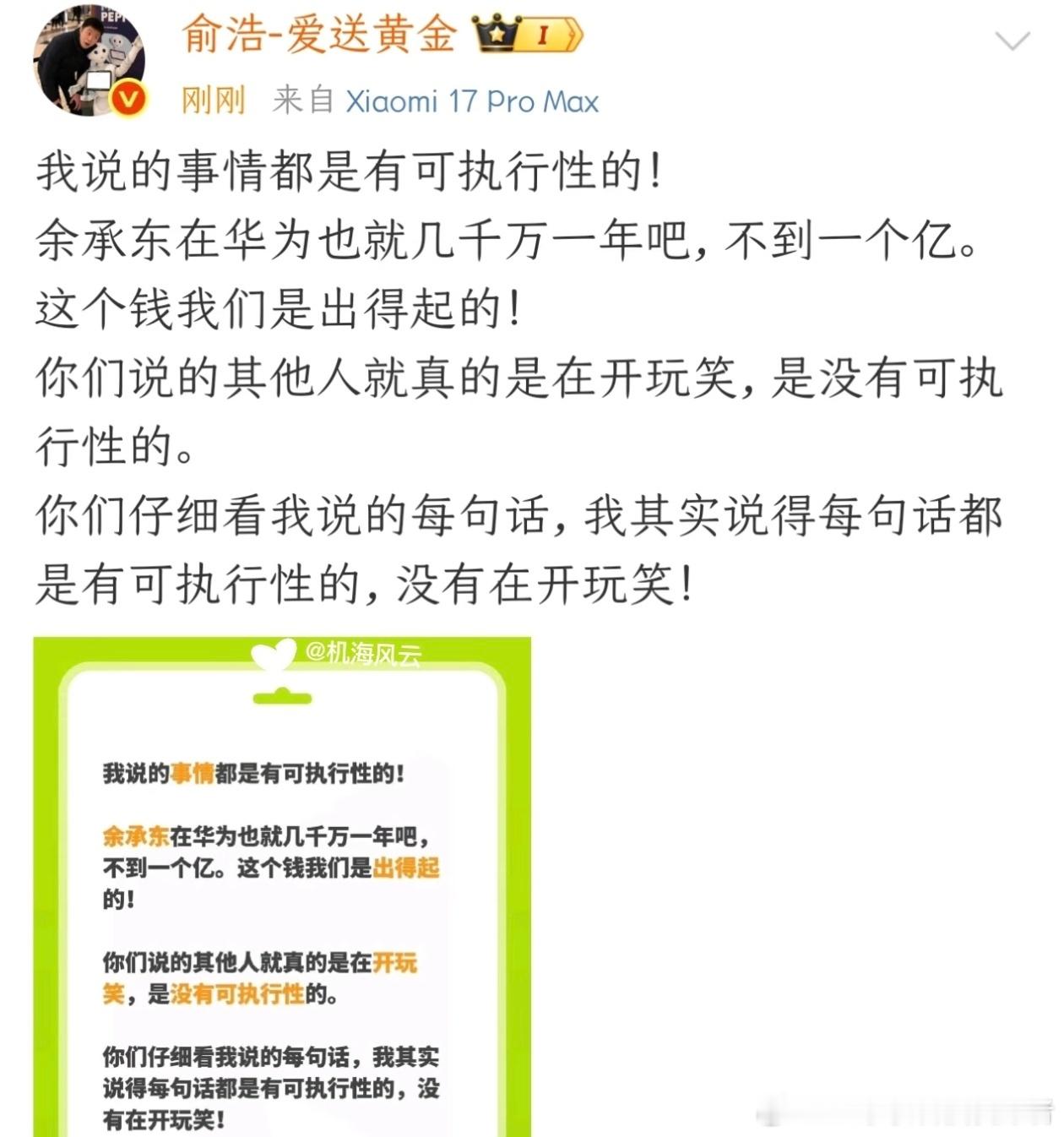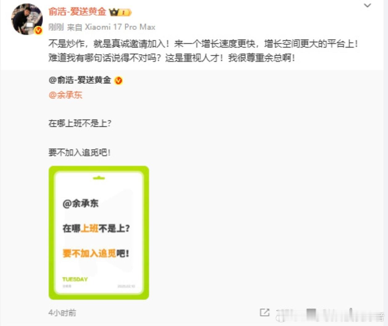 LH手机科技爱好者 追觅CEO最近又公开招募余承东加入公司,他说自己不是开玩笑,他重视人才,一年不到一个亿的工资也给得起。这些先不讨论,从结果来看基本上不可能的事,毕竟作为华为的高层领导,现在也不会随意跳槽。追觅CEO回应喊余承东加入