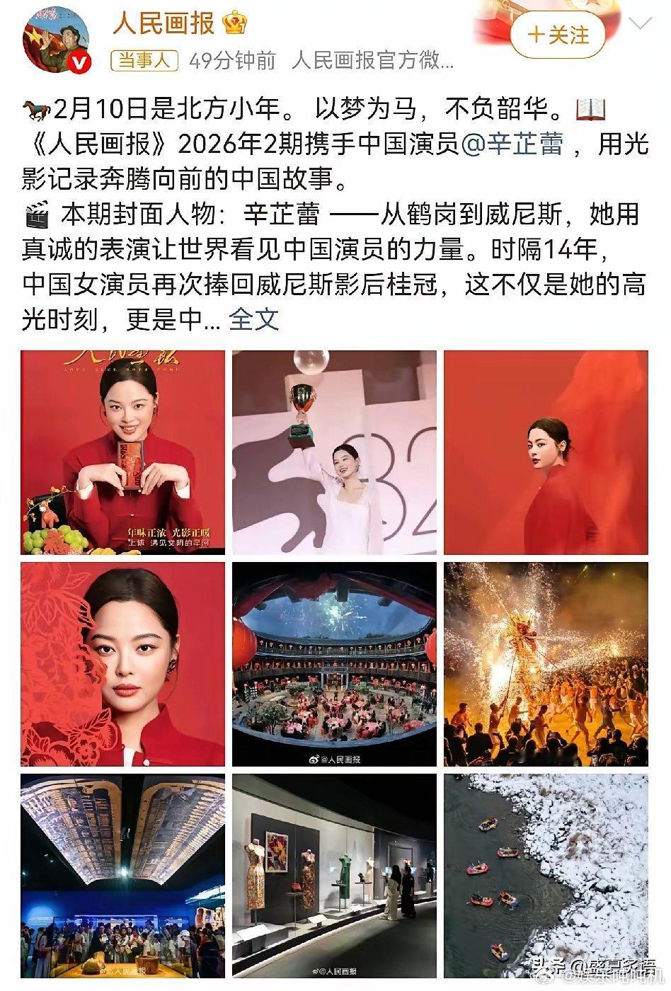辛芷蕾,让整个娱乐圈羡慕了!10日,辛芷蕾传来一个大好消息,内娱还在争时尚杂志封面,她却甩别人好几条街,解锁“天花板资源”,直奔国家级外宣刊物封面!影后加持+官方认证,这路走得也太高级了吧!2月10日,辛芷蕾再添重磅荣誉——登上《人民画报》2026年2期正刊封面!要知道这可是创刊80周年的国家级核心外宣刊物,近十年里她还是首个享单人封面礼遇的艺人,这份认可比时尚杂志含金量高太多。
