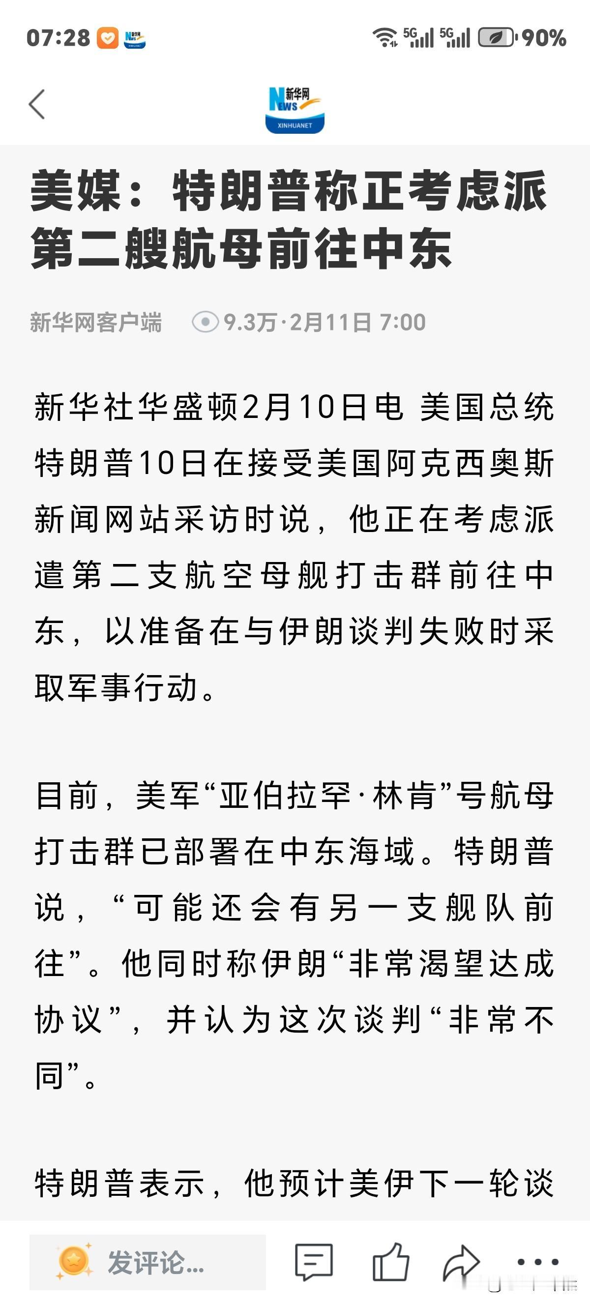 特朗普为伊核谈判能圆满达成,正考虑再派一艘航母战斗群前往中东!不仅是增加筹码,更重要是以防谈判失败做军事打击准备,免得错手不及。 因为谈判桌上说话声音大小,是取决于底气及力量优劣的。故而川普此次想法也属情理之中,并不意外。那伊朗怎么办? 我想伊朗会有思想准备,毕竟美国军事实力,多少家底,伊方心里有数。 怎么对付美国强大军事力量呢?很简单伊方必然是以不变应万变,你美方来你的航母,伊方拉出各种型号弹道导弹。你美方搞空袭,我伊方便按发射键钮,你美方炸伊方重点设施,那我伊方自然击伤或击沉你美方航母。就这么干了! 虽然知道这些,但笔者不晓得美国能否承受航母损伤?更无法预测伊核谈判最后结果。网友们咋看?