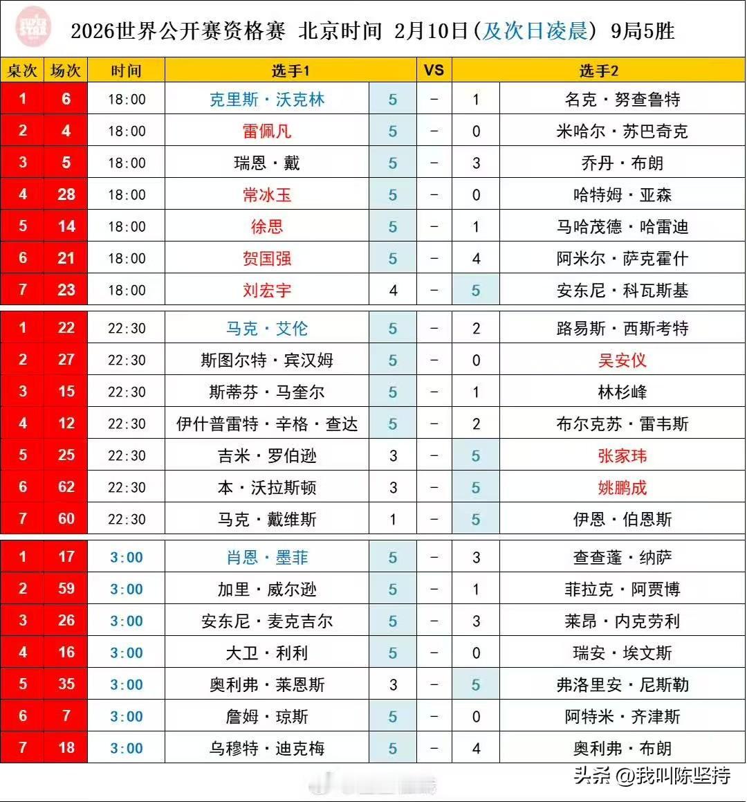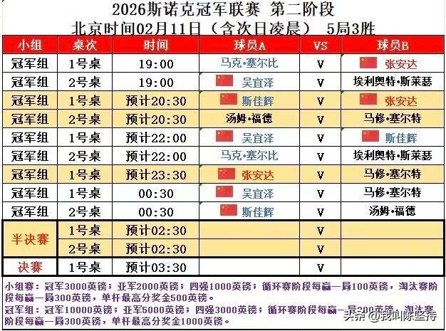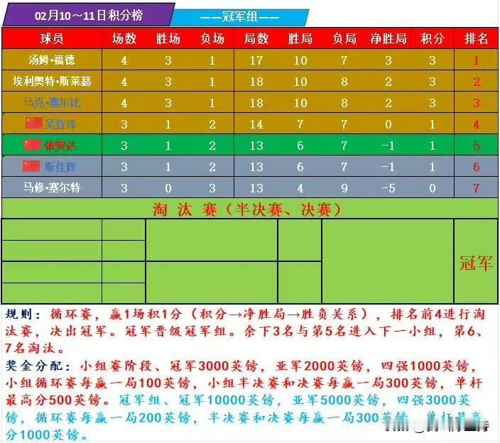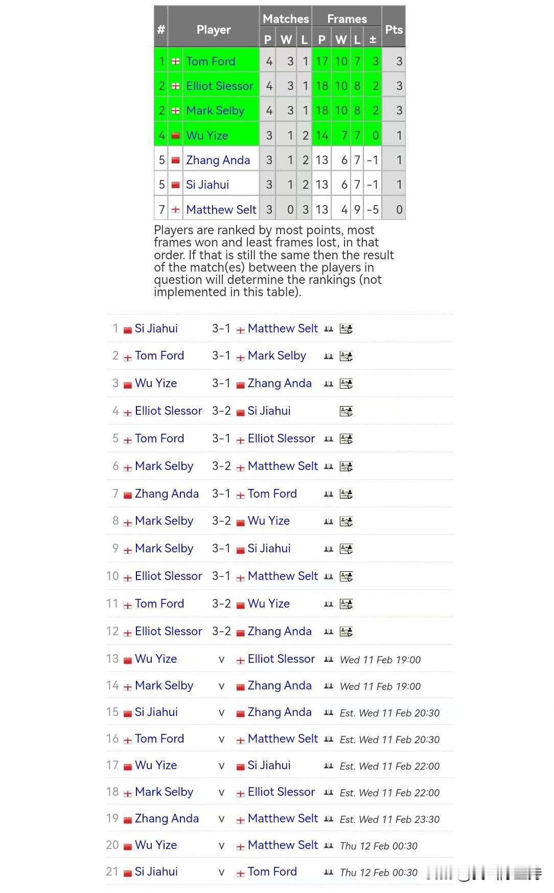 斯诺克两项比赛同时展开。 冠军联赛,中国选手发挥不佳,三名中国选手分列4/5/6名。塞尔比、汤姆福德、斯莱瑟分别3胜1负,排名前三。 斯佳辉,赢了赛尔特,输给斯莱瑟、塞尔比。 张安达,赢了汤姆福德,输给吴宜泽、斯莱瑟。 吴宜泽,赢了张安达,输给塞尔比和汤姆福德。 三名中国选手都是1胜2负。 今天冠军联赛最后一天,决出总冠军,中国选手还有机会。 玉山公开赛,中国选手表现尚可,8人参赛,6人跻身正赛,仅有吴安仪和刘宏宇被淘汰,刘宏宇也是挺可惜,0-4落后追到4-4平,最后一局率先上手打了20分断了,对手拿下90多分,刘宏宇惜败。 其他强手,墨菲、艾伦等悉数过关。 今天中国选手周跃龙、黄佳浩、许医尘、范争一、袁思俊、蓝裕豪、龙泽煌8位中国球员参赛,另外还有凯伦威尔逊等高手参赛。