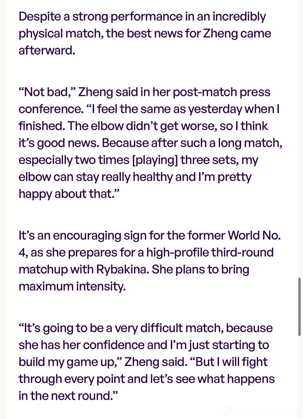 郑钦文:手肘情况不错,完赛时候感觉和前一场一样,肘部没恶化,这是好消息!Queen文在凌晨三盘苦战2小时48分钟击败了美国发球重炮手帕克斯,赛后除了胜利,最关心的就是打完这么一场高强度的对决,之前受伤的手肘感觉如何了呢……“Not bad.I feel the same as yesterday when I finished. The elbow didn’t get worse, so I think it’s good news. Because after such a long match, especially two times [playing] three sets, my elbow can stay really healthy and I’m pretty happy about that.”连续两场三盘比赛,郑钦文说手肘保持了健康,所以自己非常高兴!今晚在多哈1000赛挑战莱巴金娜,郑钦文前瞻:会是一场非常困难的比赛,因为她拥有了信心而我还在建立我的比赛,但我会每一分都拼搏,看看下一轮会发生什么!wta