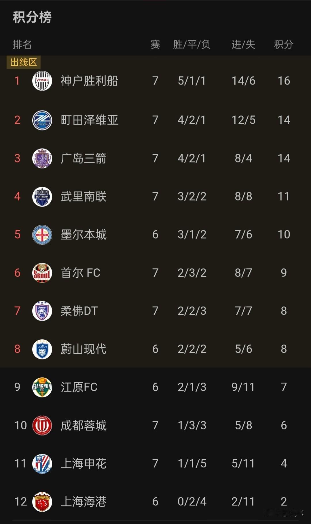 亚冠精英赛积分榜,日本排名前三,中超排名后三,这就是实实在在的差距。 昨晚亚冠精英赛第七轮战罢,积分榜上的格局一目了然:日本三强神户胜利船、町田泽维亚、广岛三箭稳居前三,形成了难以撼动的第一集团;而中超三强成都蓉城、上海申花、上海海港则排在积分榜末尾,处境艰难。这就是最直观的差距。 上海申花7战1胜1平5负,仅积4分,已提前宣告小组出局;成都蓉城1胜3平3负积6分,理论上还保留着一丝晋级希望,但也只是理论上的可能;上海海港6战0胜2平4负,更是在积分榜垫底。 再看其他对手,泰国武里南联、韩国首尔FC、澳大利亚墨尔本城的积分和排名都在中超球队之上。日本球队用稳定的表现和高效的战术,把我们甩在了身后,这几条街的差距,不是靠一两场球就能弥补的。 中国足球的路还很长,继续加油吧!