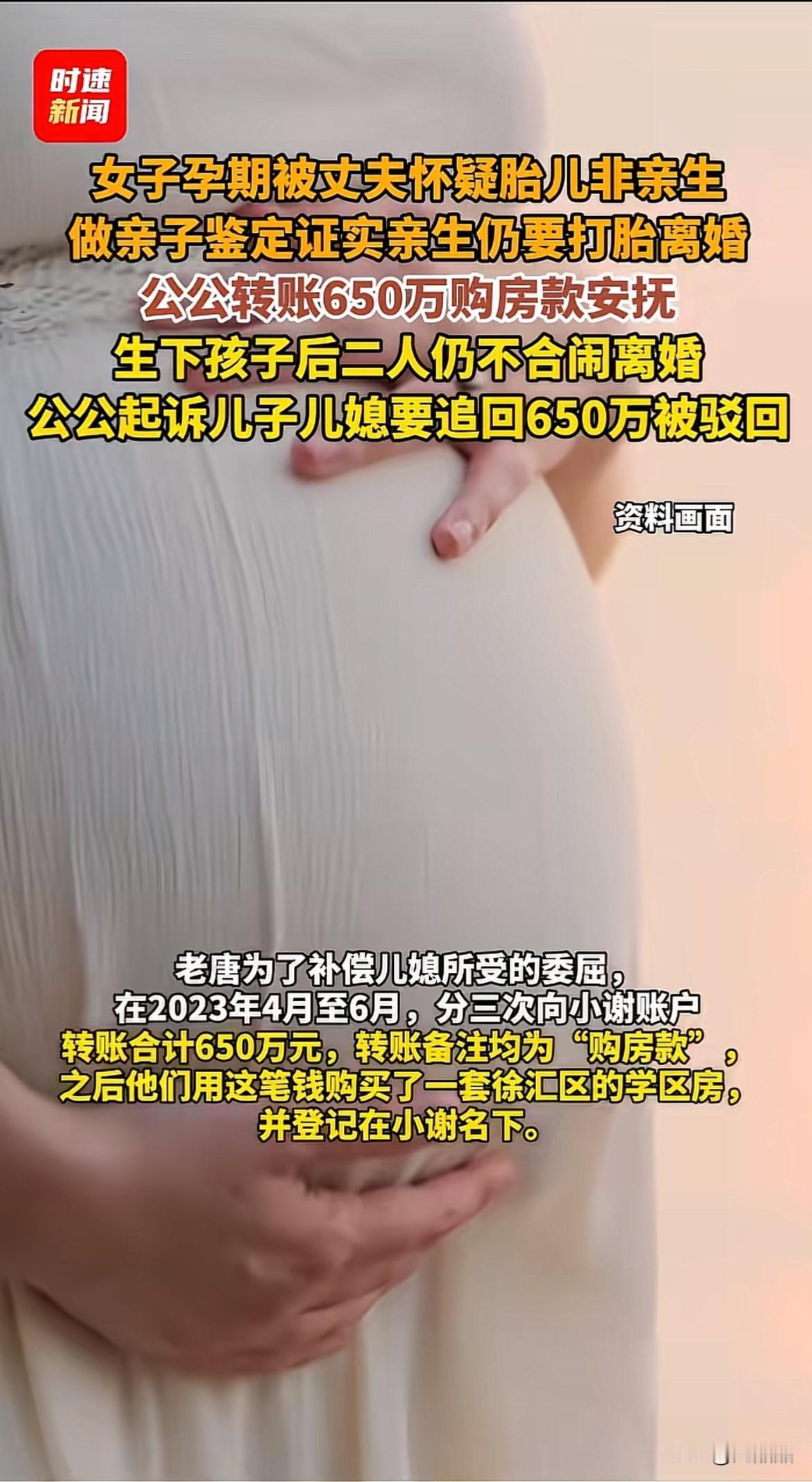 赔了夫人又折兵!上海,一女子怀孕被老公猜忌要求做亲子鉴定,结果鉴定是亲生,女子觉得受辱,要打胎离婚,公公为了挽回,转账650万给儿媳,不料孩子生下3个月后,女子和老公还是走到离婚这一步,公公反悔要追回650万,法院判了。 2020年12月,小唐和小谢结婚,婚后还算甜蜜。就当小谢发现老公小唐隐瞒了前一段婚史,两人因此事闹得不可开交,小谢觉得老公不应该隐瞒,婚姻就是要坦诚相待。 不久小谢怀孕了,可小唐却不知哪里听来的,怀疑孩子不是他的,多次要求小谢去做亲子鉴定。小谢最初担心鉴定会伤及胎儿,就没同意,可拗不过老公的一直怀疑,自己心中坦荡,就答应去做鉴定,还自己一个清白。 果不其然,亲子鉴定结果显示就是小唐亲生的。小谢越想越气,认为自己被人格侮辱,闹着要打胎,然后离婚。 公公老唐一听,绝对是自己儿子不对在先,为了保全孙子,前后三次转账650万给儿媳,备注了“购房款”,只为让儿媳消消气,不要意气用事。 儿媳看在钱的份上,也因不舍得放弃自己的亲生骨肉,也答应和好如初,生下孩子,并用这650万购买了一套学区房,登记在自己的名下。 让人没想到的是,孩子生下3个月后,夫妻俩的感情破裂,小谢提出离婚被驳回,两人分居。 公公得知后,拿出了儿子签下的借款条,把儿子儿媳告上法庭,要求他们还这650万。 但借款条只有儿子的签名,儿媳不知情,且650万购买的房子并非用于夫妻日常共同支出,法院最终驳回公公的申请。 有网友说,儿媳白嫖成功,用自己的婚姻和孩子换来了价值650万的房子,值了。 也有网友说,丈夫一家聪明反被聪明误,以为隐瞒婚史,骗得人家姑娘结婚,结果婚后还怀疑孩子非亲生,公公以为能用钱挽回儿子的婚姻和未出生的孙子,可等孙子出生后却和儿子补一份借钱,要求儿媳还钱,想空手套白狼。 不知不说,这段婚姻都是被丈夫作没的,先是隐瞒婚史,再是怀疑妻子出轨,最后还和公公写下借条,要求妻子还钱,婚姻中处处算计着,没想到最后也把自己算计进去了。 婚姻需要两人同心协力、坦诚相待,最重要的是彼此信任。用钱交易的不是婚姻和爱情,可随时都可能崩塌的买卖,用心经营才是正道。 带定位晒今日生活女子孕期被疑出轨 公公转650万安抚