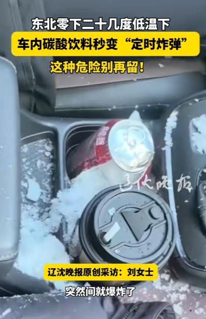 “悲剧还是发生了!”吉林,一女子将碳酸饮料放在车内一整夜,第二天上午,她开车途中,突然听到“砰!”的一声巨响,侧脸一看,发现是饮料罐爆炸了,一瞬间,车里一片狼藉,而女子则吓得半天没回过神! 谁能想到,平日里随手就能买到的罐装碳酸饮料,在东北零下二十多度的极寒天气里,竟然会突然爆炸。 那天傍晚下班,刘媛(化名)像往常一样在路边便利店买了几罐常喝的碳酸饮料,想着第二天开车路上能解解乏,便顺手把未开封的饮料罐放在副驾驶的储物格和车门侧边的置物槽里。 彼时吉林的室外温度已经跌破零下二十度,寒风卷着冷气往骨头缝里钻,夜晚的气温还会继续往下掉。 她把车稳稳停在小区户外的停车位上,锁好车门便转身回家,全程都没有多想,更没把这几罐普通的饮料和危险画上等号。 东北的冬天有多冷,只有亲身经历的人才知道,露天停放的私家车,一整夜暴露在极寒天气里,车厢就像一个没有保温层的冷冻箱,车内温度和室外几乎没有差别。 在这样的低温里,饮料里的水分在持续低温下不断降温,逐渐从液态凝结成固态,这个看似平常的结冰过程,恰恰是爆炸的导火索。 很多人都牢记夏天不能把碳酸饮料放在车内,却唯独忽略了东北零下二十多度的极寒,同样是这类饮品的 “致命禁区”,这位女车主,也恰恰踩进了这个容易被忽视的安全误区。 第二天上午,她裹紧外套坐进车里,热车之后便平稳上路,路面上结着一层薄冰,她专注地盯着前方路况,双手稳稳握住方向盘,全身心都在留意行车安全。 就在车辆匀速行驶的瞬间,一声震耳欲聋的 “砰” 然炸响突然在车厢内爆发,声音大得震得车窗嗡嗡作响。 她被这突如其来的巨响吓得浑身一僵,手指下意识攥紧方向盘,心脏猛地跳到嗓子眼,大脑瞬间一片空白,好几秒都没能反应过来发生了什么。 等她缓过神侧头看去,副驾驶的位置已经乱成一团,炸裂的饮料罐扭曲变形,金属边缘被撑得凹凸不平,冰凉的饮料混合着白色泡沫,肆无忌惮地溅在中控台、真皮座椅、车门内饰和挡风玻璃角落。 她赶紧打转向灯靠边停车,停稳后依旧坐在驾驶座上,半天没回过神,心跳久久无法平复,看着眼前乱糟糟的车厢,除了无奈,更多的是止不住的后怕。 之所以极寒环境下碳酸饮料会发生爆炸,核心是物理变化带来的压力失衡。水在结冰之后,密度会变小,体积会比液态时膨胀近十分之一。 而碳酸饮料本身密封在金属罐体里,没有任何多余的膨胀空间,同时饮料中溶解的二氧化碳,会在水分结冰的过程中被释放出来,进一步加剧罐内的压力。 当冰体膨胀的压力和二氧化碳气体的压力叠加在一起,远超金属罐体的承受极限时,炸裂就成了一瞬间的事。 和夏季高温导致气体膨胀不同,冬季低温结冰带来的破坏力更直接,罐体往往会被硬生生撑裂,飞溅的碎片和喷射的液体,一旦击中面部、眼睛等脆弱部位,后果不堪设想。 除了碳酸饮料,啤酒、气泡水等所有含气的密封饮品,在东北极寒天气下都不能长时间放在车内,它们的包装结构和内部成分,决定了同样会因低温结冰膨胀引发爆裂。 很多东北车主觉得,冬天车内没有夏季的高温暴晒,就可以随意存放各类饮品和杂物,却不知零下二十多度的低温,藏着和高温一样致命的用车风险。 冬季车内还有不少容易被忽略的危险物品,同样需要时刻留意,不少人喜欢在车内放置瓶装香水,香水中含有酒精成分,低温会让玻璃瓶身变脆。 加上车辆行驶中的颠簸,很容易出现破裂渗漏,车载充电宝、手机等锂电池设备,在极寒环境下会出现电量骤降、鼓包变形的情况,严重时还会引发电路短路。 夏季高温用车的安全常识早已深入人心,大家都会主动清理车内的易燃易爆物品,可到了冬天,低温带来的隐患却很少有人重视,正是这种习以为常的疏忽,让小小的饮料罐有了变成 “定时炸弹” 的可能。 用车安全从来都不分季节,夏季要防高温隐患,冬季更要警惕极寒风险,零下二十多度的低温里,别再把碳酸饮料留在车内。 别让看似普通的饮品,变成威胁自身安全的 “定时炸弹”,多一份细心,就少一份危险,平安出行的底气,从来都藏在这些不起眼的日常细节里。 对于这件事,您有什么想说的吗?欢迎评论区留言讨论。 信源:辽沈晚报2026-02-10——《东北零下二十几度低温下,车内碳酸饮料秒变“定时炸弹”,这种危险别再留!》