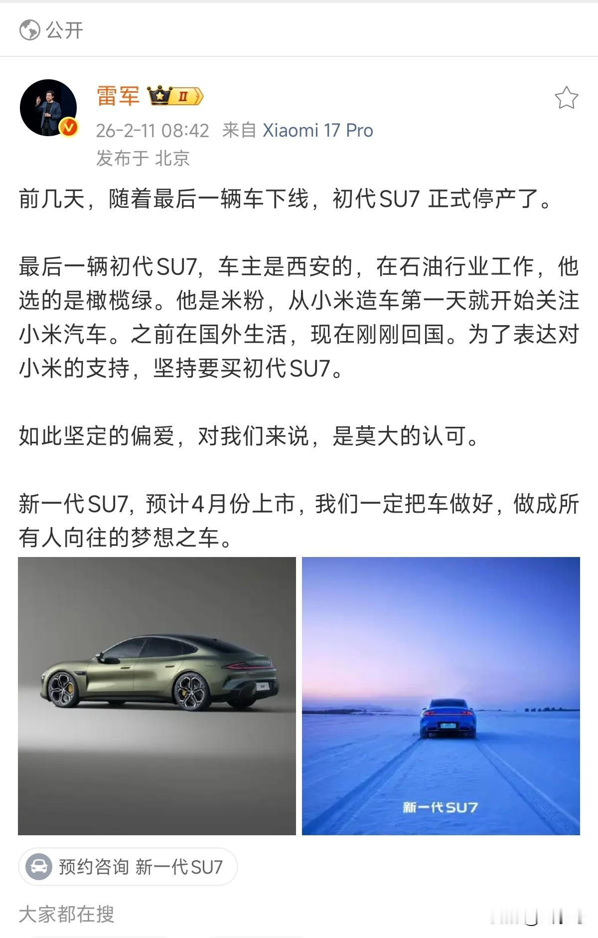 小米SU7创造了中国汽车的一个历史,作为品牌首款车型,在不到2年时间,总交付量超过38.1万辆。买下最后一辆老款SU7的用户,绝对是真爱。 向初代SU7致敬!向初代SU7的用户致敬! ​​​