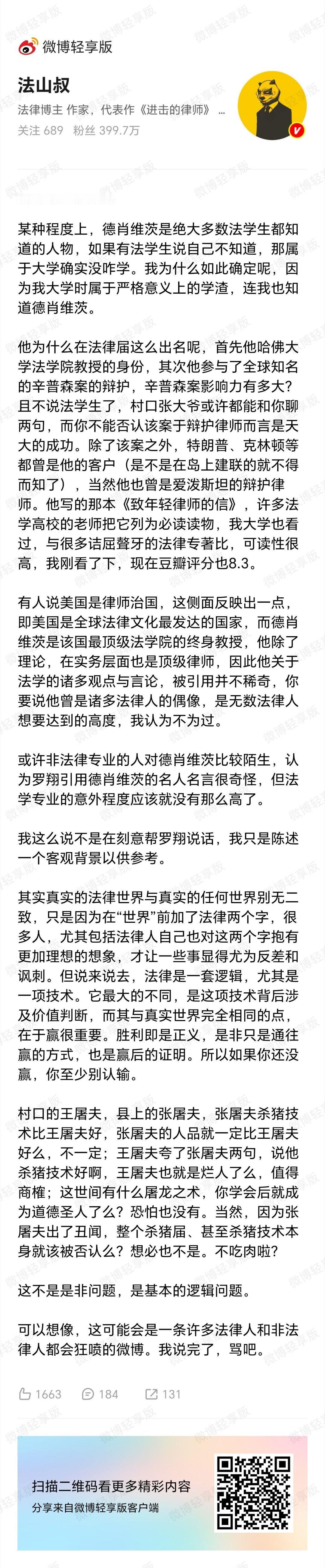 法山叔和劳大教授都谈到德肖维茨被卷入爱泼斯坦事件