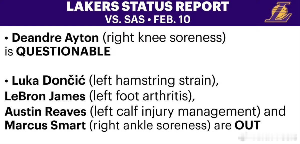 湖人最新伤病名单出炉!