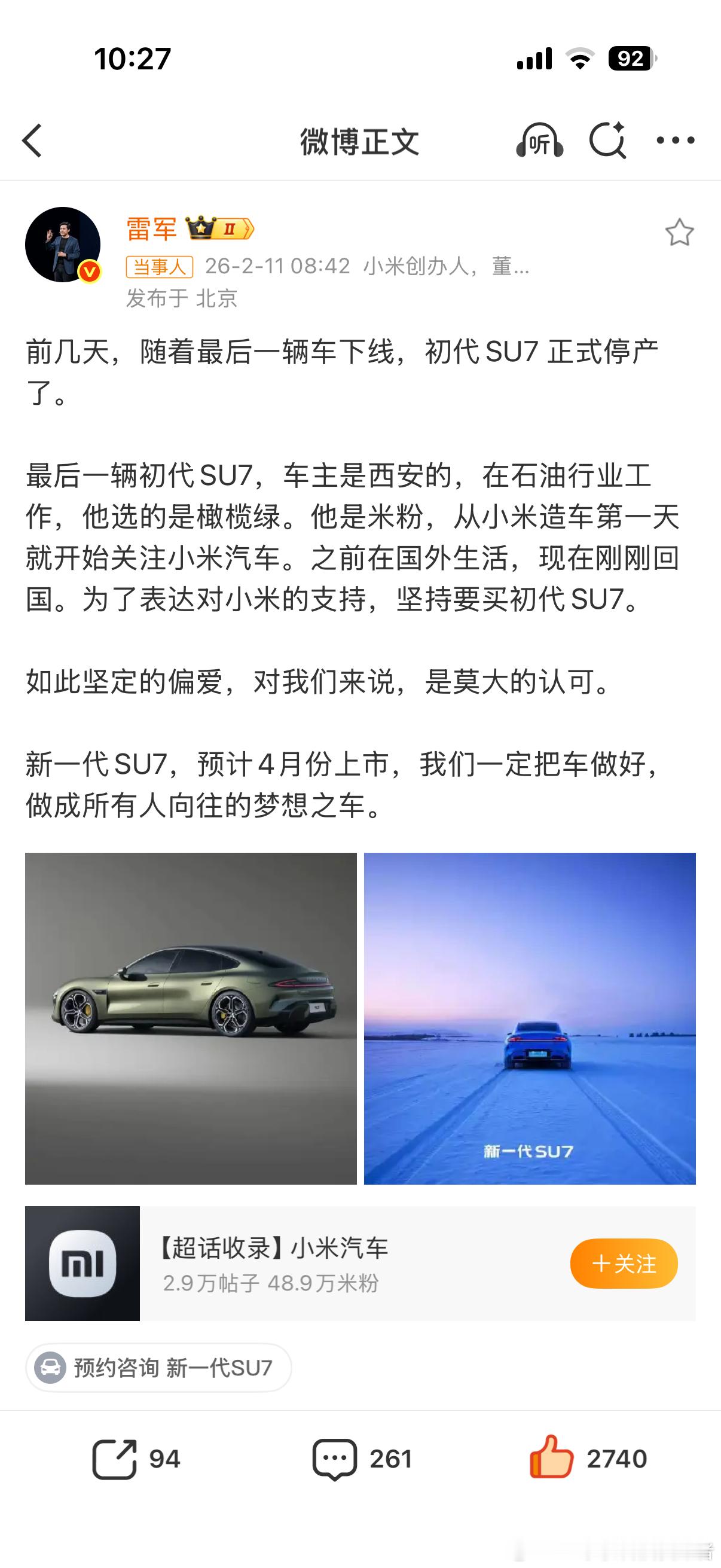 雷军称最后一辆初代SU7车主是西安人第一代小米SU7正式停产,接下来就是4月份要上市的改款小米SU7。还没入手的建议等等,第二代产品会更完善,之前的不足应该都会有提升。