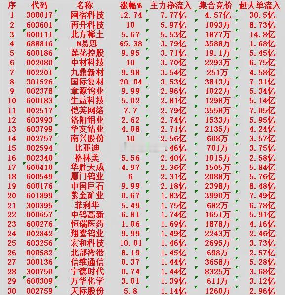 网宿科技:净流入 7.77亿元再升科技:净流入 5.97亿元北方稀土:净流入 5.53亿元N易思:净流入 3.79亿元莲花控股:净流入 3.71亿元