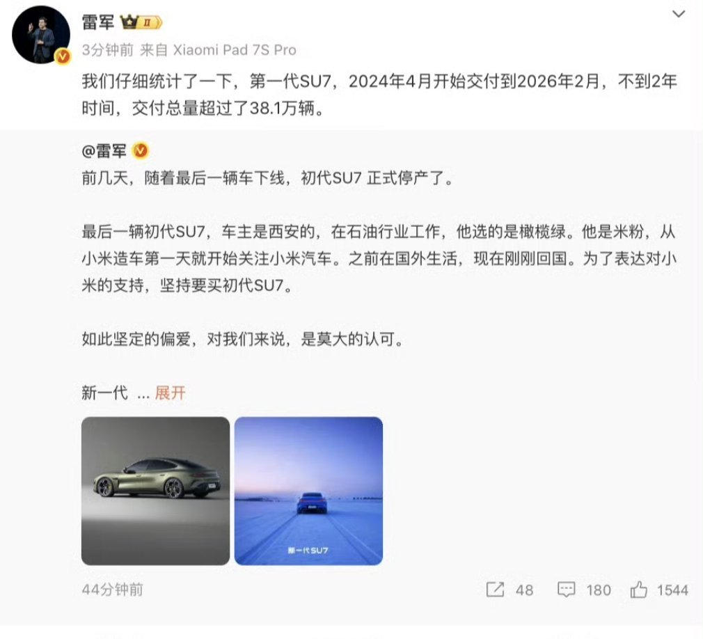 雷军称不到2年一代SU7交付超38.1万辆老一代SU7确定停产,新一代SU7有没有可能这两天就进入门店呢 第一代SU7交付总量