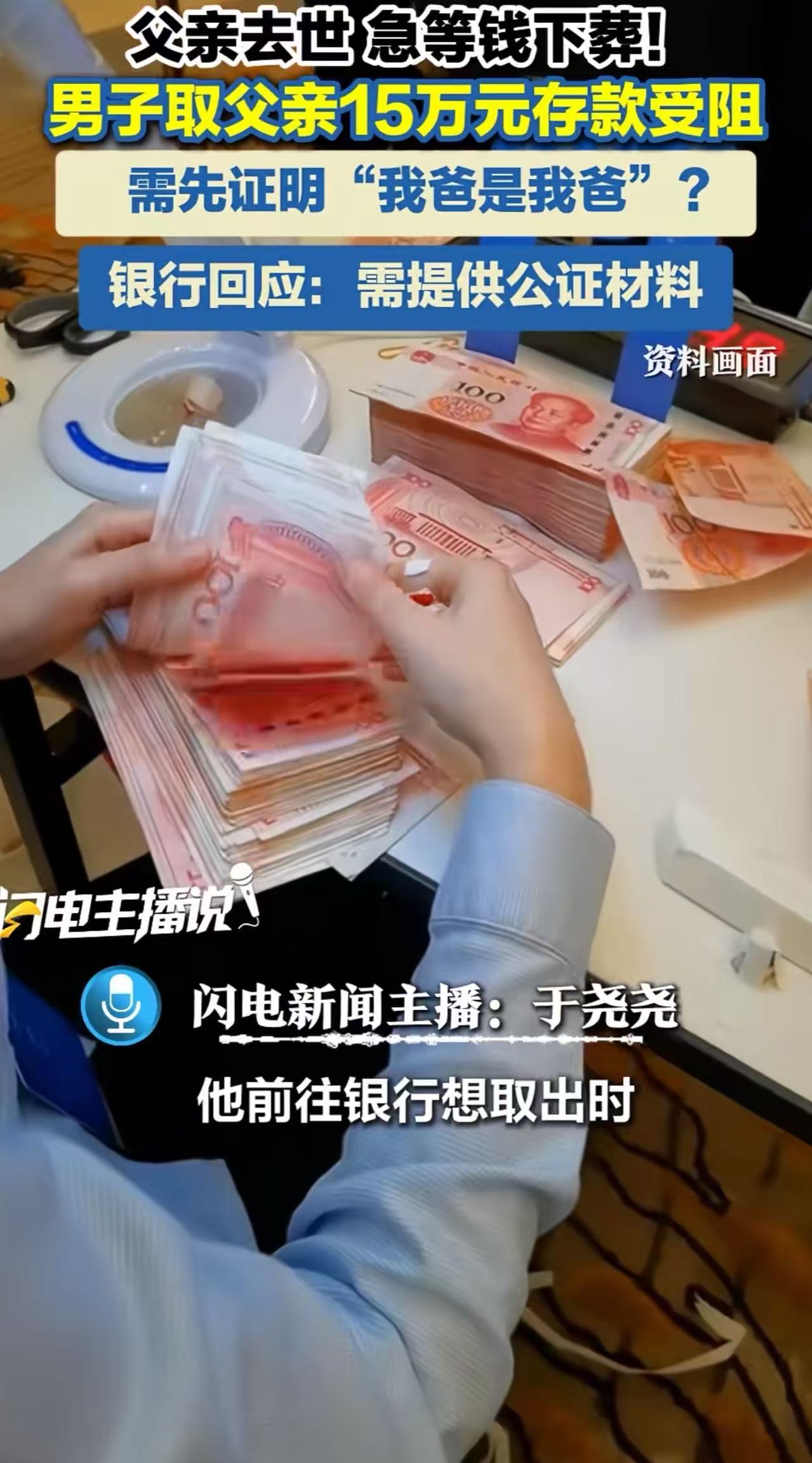 江西九江,父亲离世留下15万存款,儿子取钱却被要求证明“我爸是我爸”!儿子:这笔钱还等着用于父亲下葬。银行回应:并非故意刁难,取款总额超5万元,必须提供公证材料。