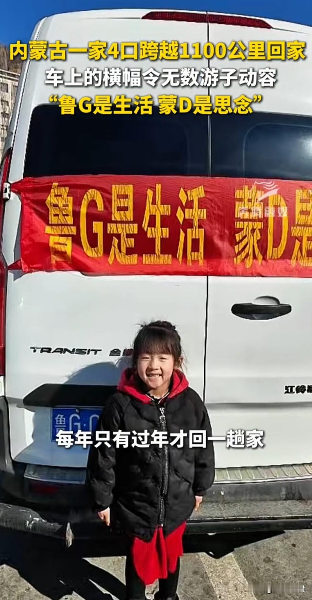 一家四口车上横幅看哭全网游子! 因为春运最暖画面出现了! 山东打拼十年的一家四口 自驾1100公里回内蒙古过年 车后挂着超戳心的横幅 “我们回家啦!还有咱家的小宝贝也在路上” 十年鲁G,一朝蒙D 从奋斗的城市回到魂牵梦绕的家乡 带着爱人、带着孩子、带着满心欢喜 奔赴一场迟来又滚烫的团圆 凌晨三四点出发 跨越千里风雪路 只为一句“回家过年” 这大概就是中国人刻在骨子里的浪漫吧❤️ 我觉得在外打拼的人都懂 不管走多远 家永远是最温柔的归途 这一幕真的看一次破防一次