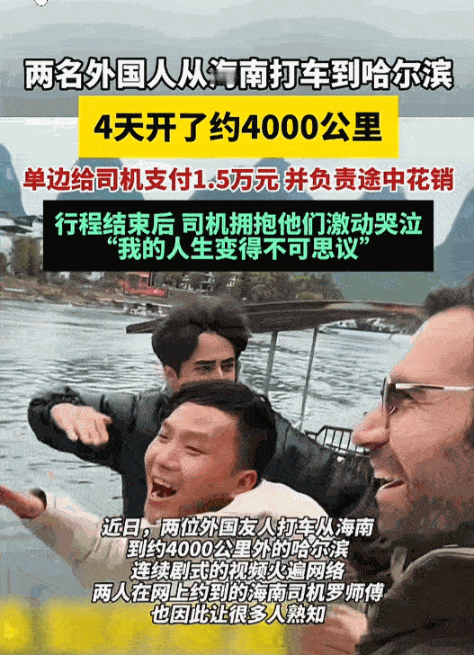“这就是有钱任性!”近日,海南,两名外国男子,为了体验中国的风土人情,竟在软件约了个出租车司机,想要从海南开到哈尔滨,这把司机吓得不轻,不过还是同意了,就这样,三人边开边玩,最终在4天后,到达了哈尔滨!司机:我的人生变得不可思议!   这俩外国男子,一个是以色列来的高佑思,平时就爱琢磨咱中国文化,还是北大国际关系学院毕业的,另一个是他的法国朋友萧闱鸿,俩人对咱中国文化,那都是迷得不行。   这次出门,他俩就是不想再跟以前似的,逛景点走马观花看一眼就完事,只想慢慢走、慢慢逛,真正摸到咱中国不同地方的烟火气,看看不一样的山山水水、风土人情。   一开始,他俩在打车软件上找司机,想找个愿意接这趟长途活的,结果碰了一鼻子灰,找了好几个司机,一听说要从海南开到哈尔滨,全都直摇头拒绝。   毕竟这路程太远了,一路上不确定的事儿太多,谁也不敢轻易接这活儿,直到碰到海南的罗师傅,才算接住了这份特殊的邀约。   罗师傅刚听说这事儿的时候,心里也挺懵的,吓了一跳,可他骨子里就透着一股子爽快,再加上自己也有点向往远方,就没再多犹豫,哪怕知道这一路不好走,也还是应下了这活儿。   旅程的起点,就在暖烘烘的海南海口,俩外国大哥和罗师傅碰了面,就正式踏上了这趟超过四千公里的长途之行。   刚出发的时候,三个人先坐轮渡过琼州海峡,看着船慢慢穿过一望无际的大海,开了好几个小时,才顺利到了广东徐闻港,从这儿开始,才算真正走上了往北去的陆路。   这一路他们压根没想着赶时间、抢进度,反倒抱着“慢慢看风景、沉浸式感受”的心思,一路往北开,先后经过了广西桂林、湖南岳阳、河南开封、北京、辽宁沈阳好多个地方,把南国的暖和、北国的冷,还有江南的秀气、中原的厚重,全都看了个遍。   路过桂林阳朔的时候,他们特意停了下来,好好瞅了瞅桂林山水的奇特秀丽,感受着山水相依的温柔。   开到中原古都的时候,伸手摸了摸千年城墙的老痕迹,实实在在体会到了咱华夏文明的源远流长;一踏进北国的地界,第一次见到千里冰封、万里雪飘的壮观景象,也真切感受到了冰雪世界的寒冷和壮阔。   不过路上也出了点小意外,他们坐的那辆车,突然就出故障了,好在三个人都没想着半途而废,在桂林赶紧租了一辆新车,收拾收拾东西,继续往前开。   一路上,三个人互相体谅、互相照应,白天开车赶路、沿途看风景,晚上找地方休息,足足开了四天时间,最后总算顺顺利利到了这次旅程的终点——哈尔滨冰雪大世界,给这趟特殊的跨域之行,画上了一个圆满的句号。   为了让罗师傅没后顾之忧,俩外国大哥刚出发的时候,就主动给罗师傅预支了一万五千元的费用,还郑重其事地承诺,一路上所有的开销,不管事油费、过路费,还是三个人的吃住,全都由他俩来承担。   就这么一场看着特“离谱”的旅程,很快就引发了网友们的热议,大伙儿的看法五花八门。   有网友感慨,这事儿真的太少见了,觉得这俩外国大哥,用最朴素、最真诚的方式,表达了对咱中国文化的热爱,打破了不同文化之间的隔阂,比那些刻意拍出来的文化宣传,更让人感动、更有感染力。   也有网友比较理性,直言不讳地说,坐出租车开这么远的路,又费时间又费力气,而且跨城市打出租车,本身就有很多行业规范上的争议,这种做法虽然新鲜,但是根本没法复制。   这趟从海南到哈尔滨的行程,从来都不只是一段跨越四千公里的路,更是一场不同文化之间的温情相遇,一次普通人打破平庸、改变人生的真实经历。 信息来源:每日热搜