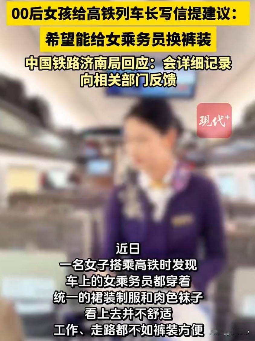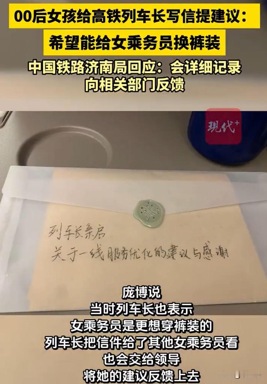 一条小小的建议,戳中了无数打工人的心声。00后女生庞博坐高铁时,细心发现车上女乘务员统一穿着裙装、搭配肉色袜子,长时间走动、弯腰服务很不方便,于是她拿出纸笔,认真写了一封信交给列车长,建议给乘务员换上更实用的裤装,这段经历发到网上后,立刻引来大量网友支持,大家都觉得,职业制服不该只讲好看,更要实用、舒服、安全。高铁乘务员的工作强度并不小,要来回巡查、搬运行李、帮乘客调整座椅、处理各种突发情况,全程都在走动和忙碌。穿裙装虽然看上去整齐美观,但实际工作中很受限制,弯腰怕走光,走动不方便,遇到紧急情况还要担心动作幅度,长期下来不仅累,还存在安全隐患。不少乘务员私下也更愿意穿裤装,只是碍于统一着装要求,只能一直穿裙装上班。这件事也让很多人想到,同样是服务行业,不少航空公司已经给空乘配备了裤装选项,兼顾形象与实用,高铁作为大众出行的主力交通,更应该跟上节奏,让一线工作人员穿得舒心、干得安心。铁路部门对此回应称,并没有强制要求必须穿裙装,会认真记录建议,在后续换装时综合考量,这番回应也让大家看到,合理的诉求正在被听见、被重视。事件发酵后,铁路部门也做出回应,表示并没有强制要求必须穿裙装,现行制服主要是为了统一形象,会认真记录这条建议,在后续换装时综合考量。这个回应很温和,也让大家看到,改变并不是不可能,只是需要一个更贴近一线需求的调整。这件事看似只是换一件衣服,其实是对职场女性的尊重,真正的职业形象,从来不是靠裙子和高跟鞋撑起来的,而是专业、负责、贴心的服务。让劳动者穿得舒服、穿得安全,才能更好地投入工作。一封小小的建议信,承载的是善意与体谅,也推动着大家对职场着装的重新思考,希望高铁女乘务员能早日拥有裤装选择权,让每一份辛苦都被看见、被善待。 来源,现代快报