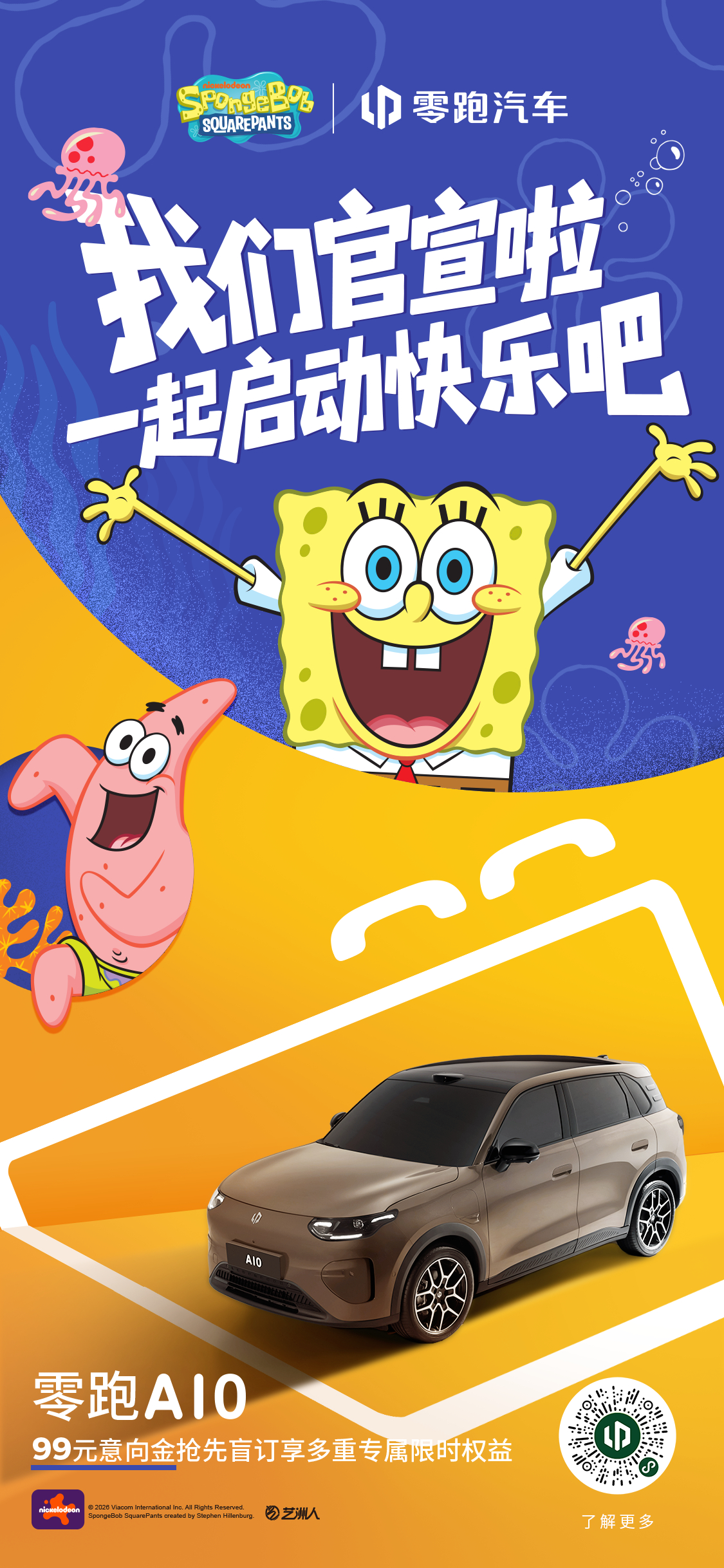 启动我的快乐,我准备好了!小年小欢喜,新岁新伙伴零跑A10 &海绵宝宝联名官宣啦快乐出发,生活就该嘻嘻哈哈马年放开跑,做个快乐的显眼包