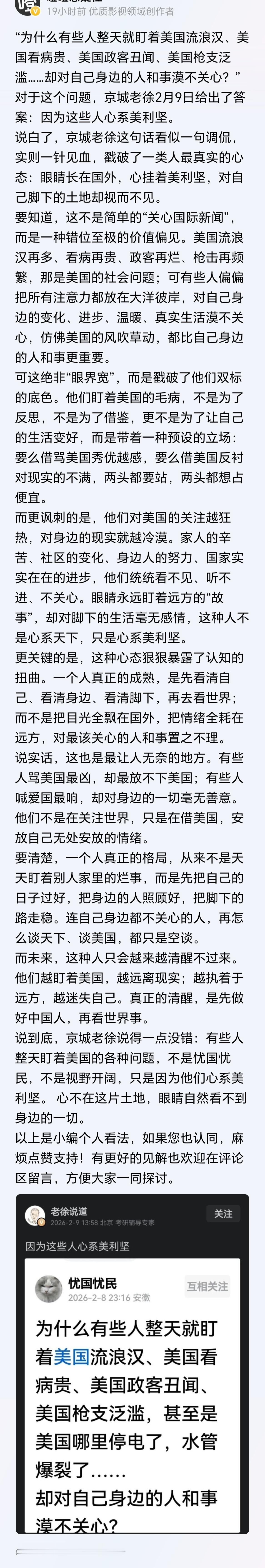 一个精至利己主义者,门面上是要人民关心自己身边的事,实则是:他最害怕别人戳穿美利坚的西洋镜。刺痛他心心念念的美国梦。