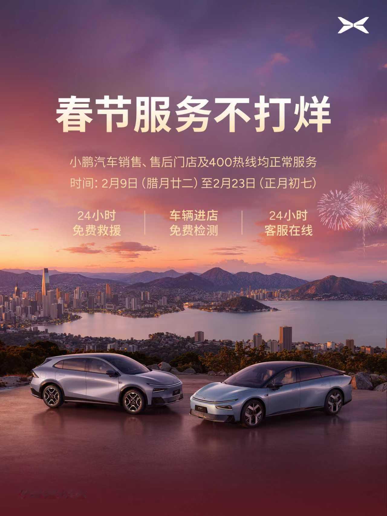 为护航春运出行,小鹏汽车已提前对高速及热门景区周边充电网络完成专项巡检维护,保障补能效率。春节期间,全国销售、售后门店将安排专人值守,24小时免费道路救援与客服热线实时响应,并为车主提供关键部件免费检测服务,全方位守护车主出行安全,用实际行动保障团圆之路畅通大v聊车