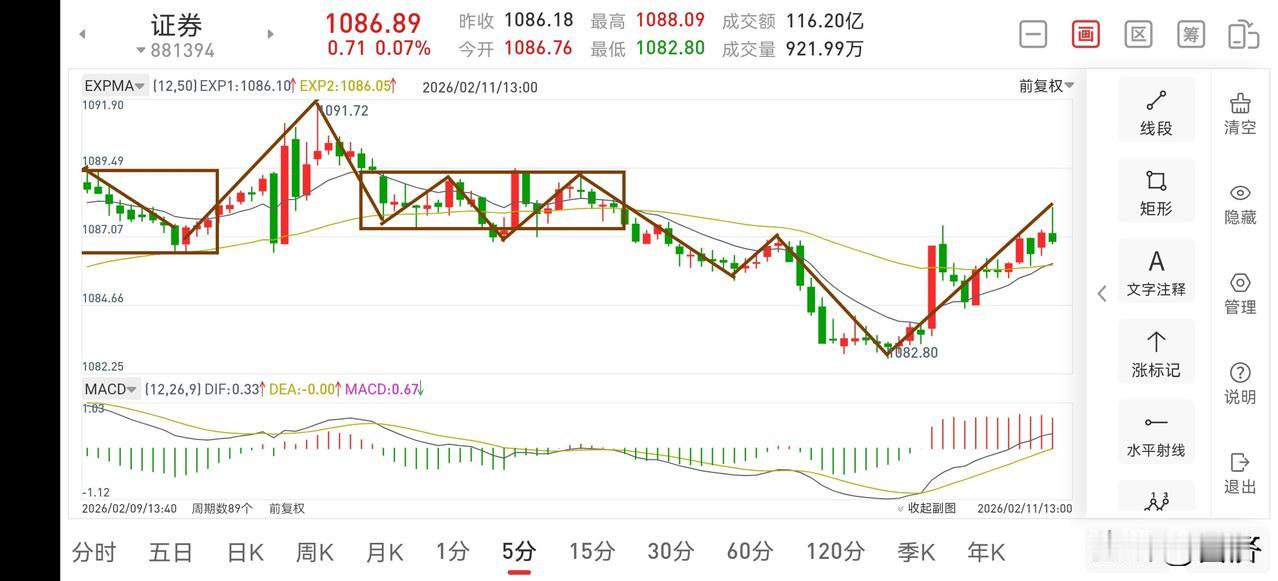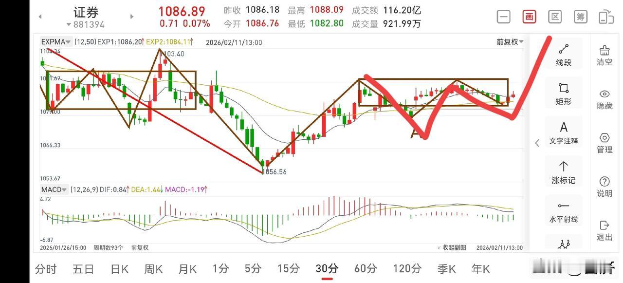 聊聊证券板块(2026.2.11) 先说结论:证券板块走势正常,目前就是一个蓄势整理的过程,操作上耐心持股待涨即可。 1.从30分钟图一上看,目前已经构建了一个30分钟中枢平台,下午有望向上突破,所以操作上紧紧拿住手中筹码持股待涨即可。 2.从5分钟图二上看,虽然还在中枢下方运行,但上午的反弹已经进入了中枢区间,而且这笔30分钟的回踩已经出现了二卖和三卖,此处可以判定已出现转折,下午虽还会有回踩,但也是构建5分钟二买的过程,所以此处是可考虑积极做多的。 3.商业航天正在构建一个周线中枢区间,目前正在构建中枢下沿,操作上耐心持股待涨即可。证券板块动态 探讨股市最新走势