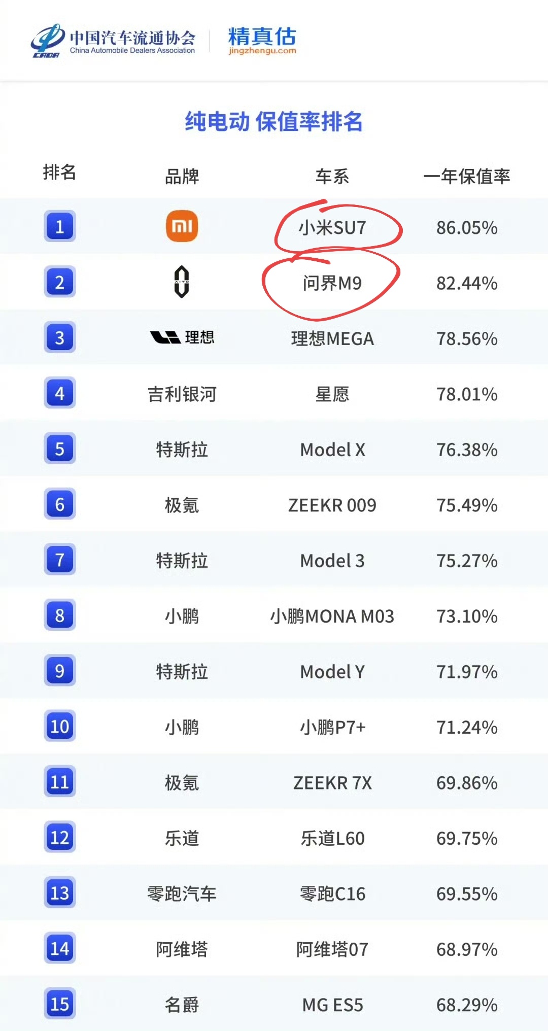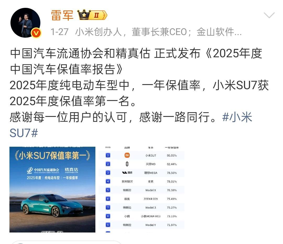 雷军:小米SU7获2025年度纯电车型保值率第一名余承东: 问界M9为中国新能源车(含纯电、增程)保值率第一你两到底谁才是第一啊?