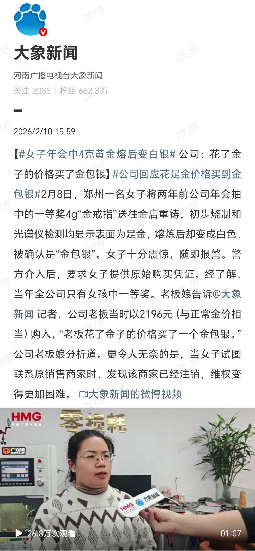 女子年会中4克黄金熔后变白银女子年会抽到的“金戒指”熔后变白银,这剧情反转得比翻书还快。公司花足金价格却买到金包银,看似无辜,实则暴露了采购的不严谨。商家注销,女子维权难,更是给这糟心事雪上加霜。企业年会本是凝聚人心的好事,如今却成了闹剧。这不仅寒了员工的心,也给企业形象抹了黑。希望企业能重视此事,给员工一个合理交代,别让诚信在利益面前“熔”掉。