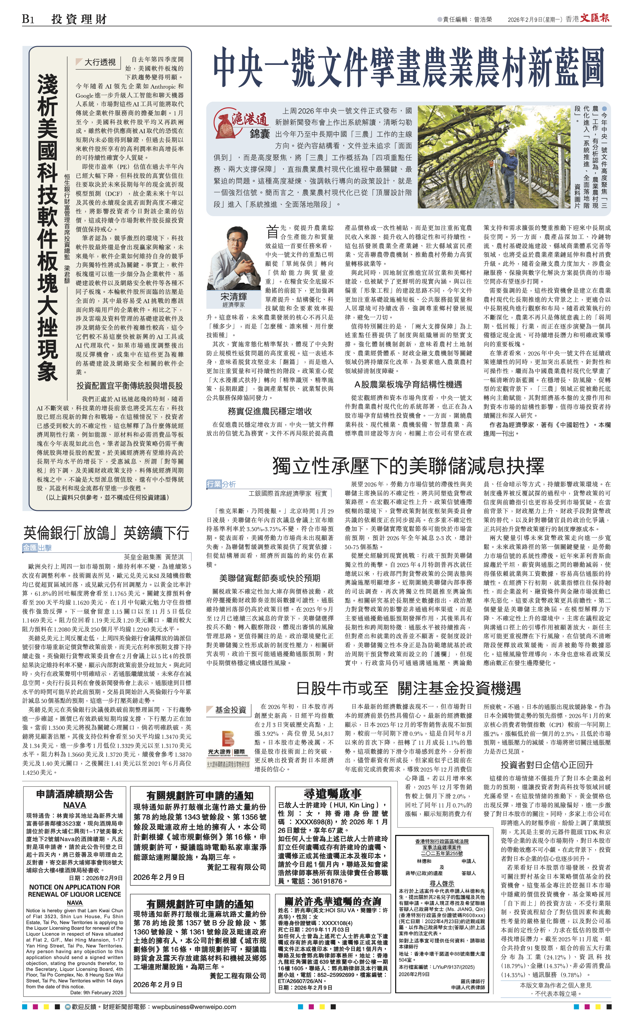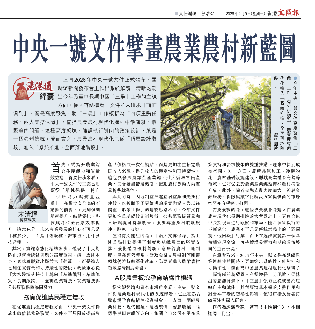 #沪港通锦囊# 中央一号文件擘画农业农村新蓝图。据香港文汇报,上周2026年中央一号文件正式发布,国新办新闻发布会上作出系统解读,清晰勾勒出今年乃至中长期中国「三农」工作的主线方向。从内容结构看,文件并未追求「面面具到」,而是高度聚焦,将「三农」工作概括为「四项重点任务、两大支撑保障」,直指农业农村现代化进程中最关键、最紧迫的问题。这种高度凝炼、强调执行导向的政策设计,就是一个强烈信号。简而言之,农业农村现代化已从「顶层设计阶段」进入「系统推进、全面落地阶段」。 首先,从提升农业综合生产能力和质量效益这一首要任务来看,中央一号文件的重点已明显从「单纯保供」转向「供给能力与质量并重」。在粮食安全底线不动摇的前提下,更加强调单产提升、结构优化、科技赋能和全要素效率提升。这意味着,未来农业发展的核心不再只是「种多少」,而是「怎么种、谁来种、用什么技术种」。 其次,实施常态化精准帮扶,体现了中央对防止规模性返贫问题的高度重视。这一表述本身,意味着脱贫攻坚并未「翻篇」,而是进入更加注重质量和可持续性的阶段。政策重心从「大水漫灌式扶持」转向「精准识别、精准施策、长期跟踪」,强调产业帮扶、就业帮扶与公共服务保障协同发力。详见2026年2月9日B1。#经济学家宋清辉#