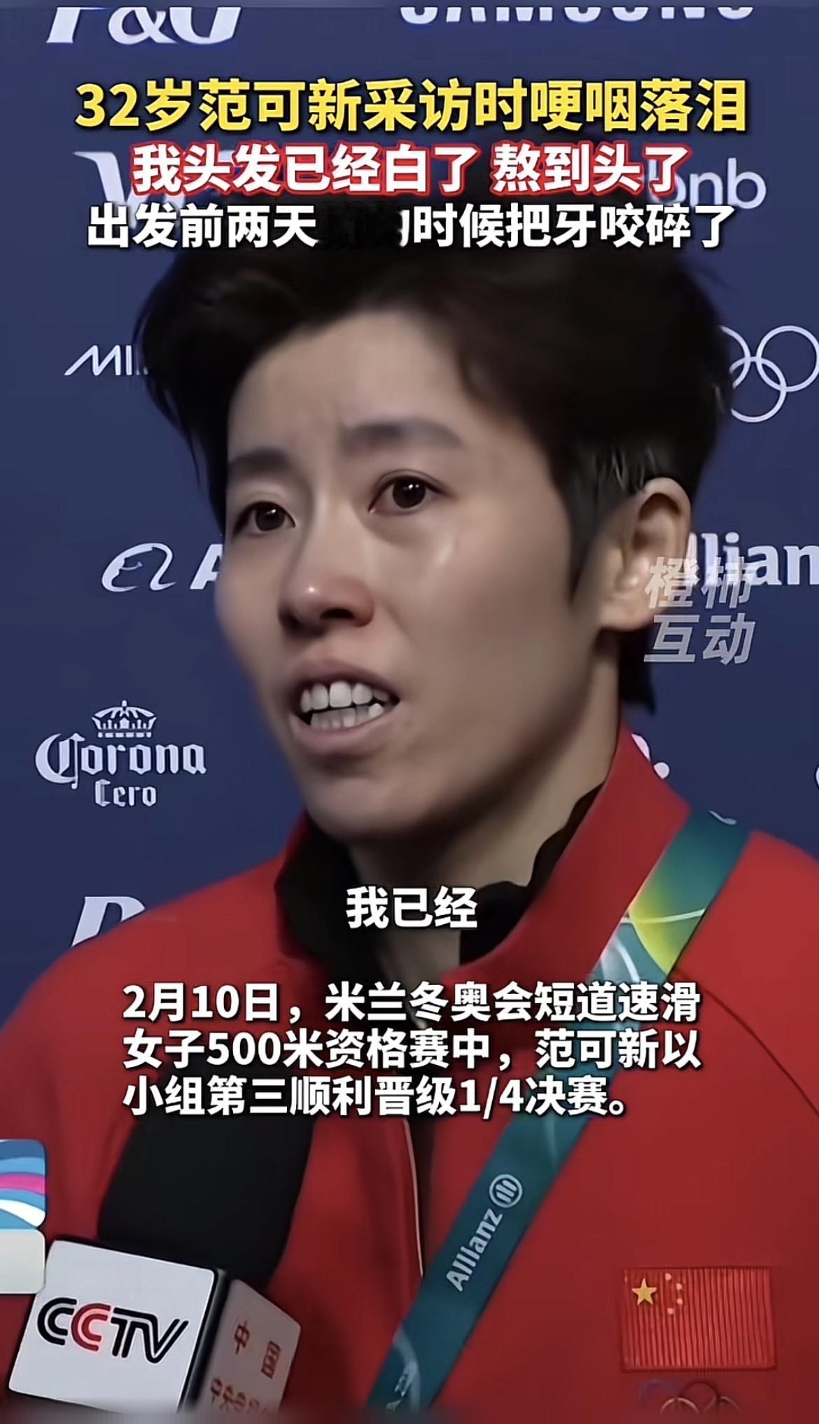 米兰冬奥会短道速滑女子500米资格赛,33岁四朝元老范可新以小组第三惊险晋级。赛后她眼含热泪,坦言自己已熬到头,头发熬白,赛前两天拼到牙齿咬碎。这不是修辞,是老将用二十年坚守写下的真实注脚。从年少成名到咬牙坚守,她把热爱刻进冰刀,把坚持融进每一次起跑。白发是勋章,碎牙是风骨,范可新用尽全力,不负热爱,不负家国。致敬每一份不放弃的坚守,致敬永不言弃的中国老将!米兰冬奥资格赛
