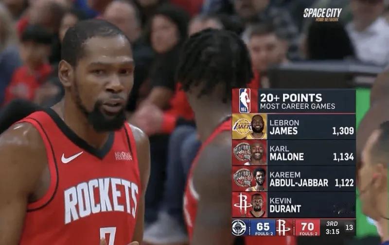 火箭赢快船,大家都知道了。 说点大家不知道的。 此役,杜兰特再度砍下20+,职业生涯20+场次,达到1000场! NBA历史第四。 不要觉得这没啥,让你看看,这份榜单,前三都是一些什么人? 第一, 詹姆斯1309场。 第二, 马龙1134场。 第三, 贾巴尔1122场。 第四, 杜兰特1000场。 这些都是神人来着。 天才只是见到他们的门槛而已。 一般球星,都进不去。 强如乔丹,科比也没有做到。 他需要你有天赋,耐造,还需要你十年如一日稳如老狗的超强个人能力,持续输出。 而杜兰特又是最特别的一个,他跟腱断裂大伤过。 付出之后,依然,能有这种水准,有这种输出。 试想一下,他巅峰到底多强?